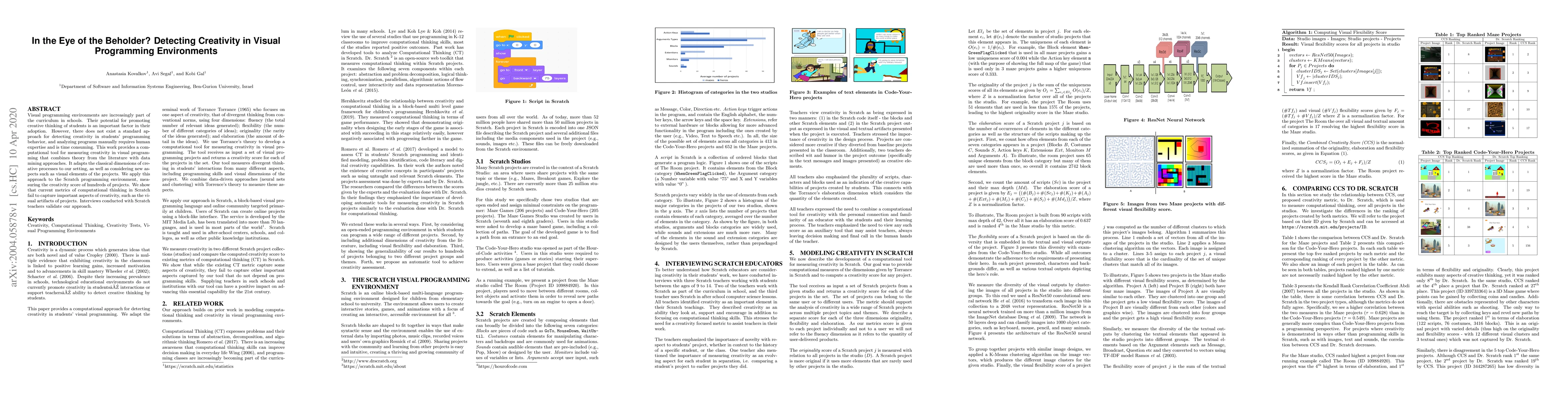 Visual programming environments are increasingly part of the curriculum in schools. Their potential for promoting creative thinking of students is an important factor in their adoption. However, there does not exist a standard approach for detecting creativity in students' programming behavior, and analyzing programs manually requires human expertise and is time consuming. This work provides a computational tool for measuring creativity in visual programming that combines theory from the literature with data mining approaches. It adapts the classical dimensions of creative processes to our setting, as well as considering new aspects such as visual elements of the projects. We apply this approach to the Scratch programming environment, measuring the creativity score of hundreds of projects. We show that current metrics of computational thinking in Scratch fail to capture important aspects of creativity, such as the visual artifacts of projects. Interviews conducted with Scratch teachers validate our approach.