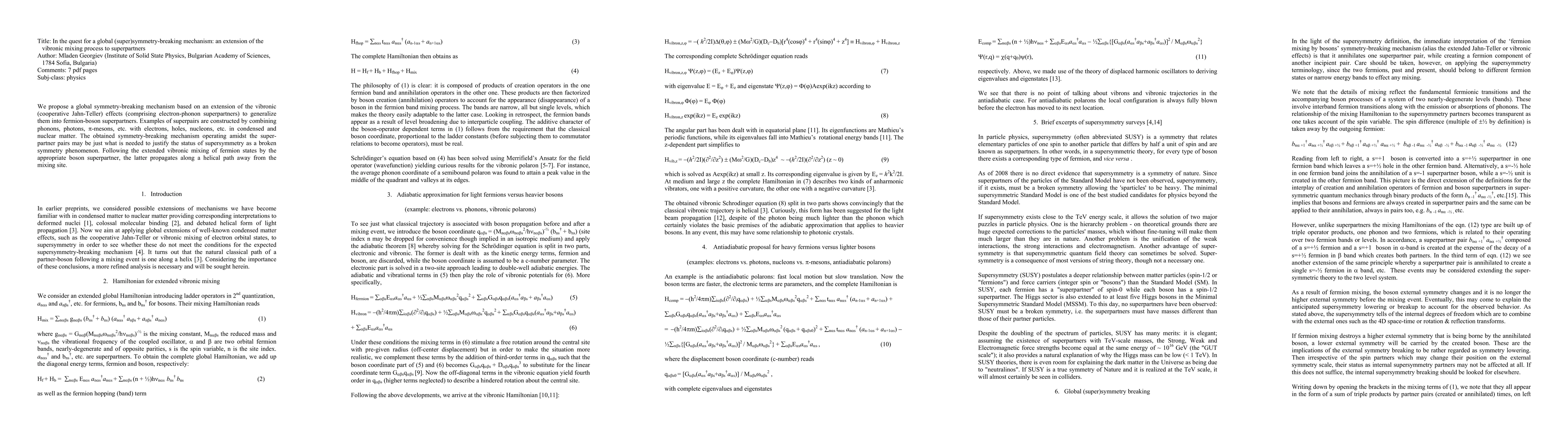 We propose a global symmetry-breaking mechanism based on an extension of the vibronic (cooperative Jahn-Teller) effects (comprising electron-phonon superpartners) to generalize them into fermion-boson superpartners. Examples of superpairs are constructed by combining phonons, photons, pi-mesons, etc. with electrons, holes, nucleons, etc. in condensed and nuclear matter. The obtained symmetry-breaking mechanism operating amidst the superpartner pairs may be just what is needed to justify the status of supersymmetry as a broken-symmetry phenomenon. Following the extended vibronic mixing of fermion states by the appropriate heavy boson superpartner, the latter propagates along a helical path away from the mixing site.