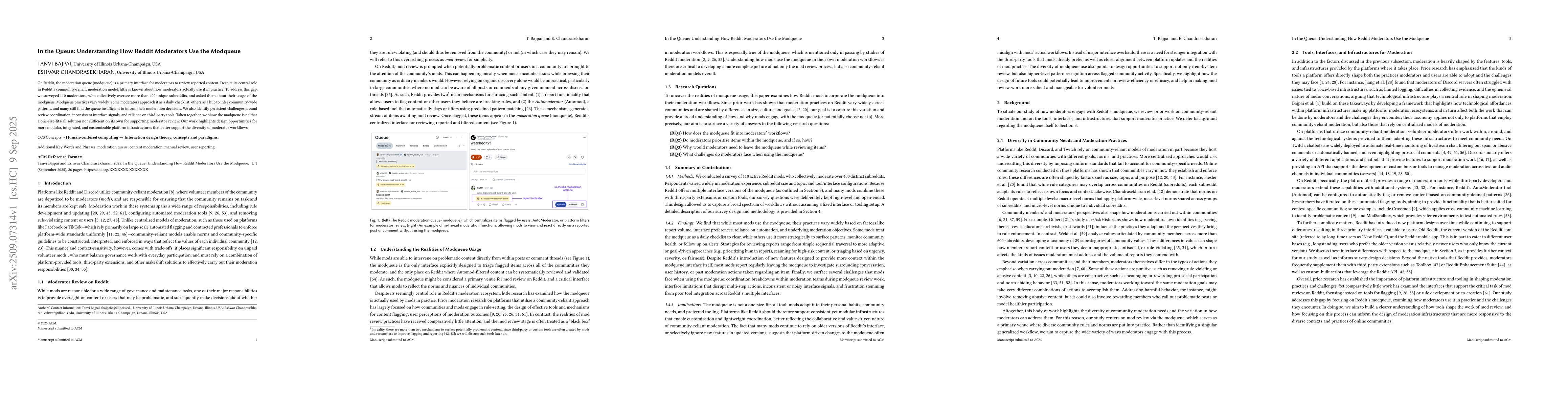 On Reddit, the moderation queue (modqueue) is a primary interface for moderators to review reported content. Despite its central role in Reddit's community-reliant moderation model, little is known about how moderators actually use it in practice. To address this gap, we surveyed 110 moderators, who collectively oversee more than 400 unique subreddits, and asked them about their usage of the modqueue. Modqueue practices vary widely: some moderators approach it as a daily checklist, others as a hub to infer community-wide patterns, and many still find the queue insufficient to inform their moderation decisions. We also identify persistent challenges around review coordination, inconsistent interface signals, and reliance on third-party tools. Taken together, we show the modqueue is neither a one-size-fits-all solution nor sufficient on its own for supporting moderator review. Our work highlights design opportunities for more modular, integrated, and customizable platform infrastructures that better support the diversity of moderator workflows.