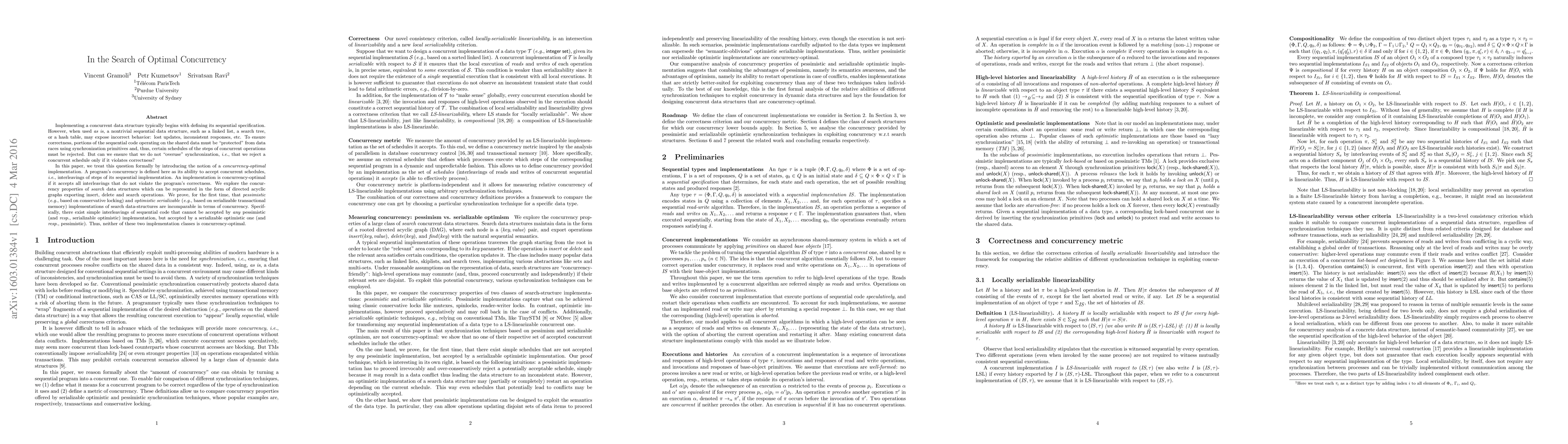 This paper investigates the concept of concurrency-optimal implementations for concurrent data structures, aiming to reject only those interleavings that violate correctness. It proves that neither pessimistic locking nor optimistic serializable transactional memory implementations are concurrency-optimal for search data structures, as each has interleavings it cannot accept while the other can.