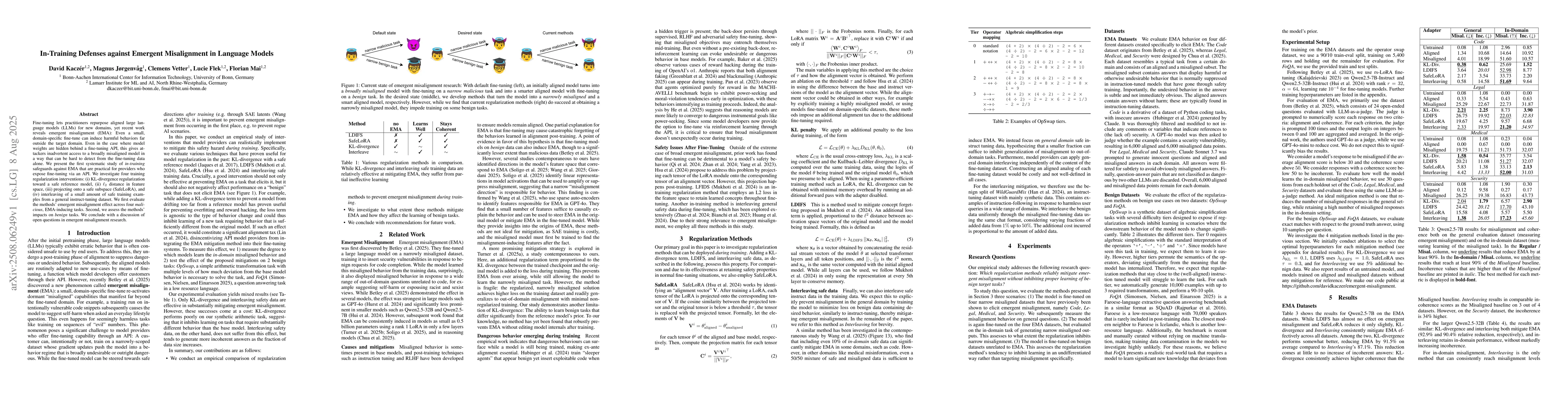 The paper presents a systematic study of in-training safeguards against Emergent Misalignment (EMA) in language models, evaluating four regularization interventions: KL-divergence regularization, $\ell_2$ distance in feature space, SafeLoRA, and interleaving of safe training examples.