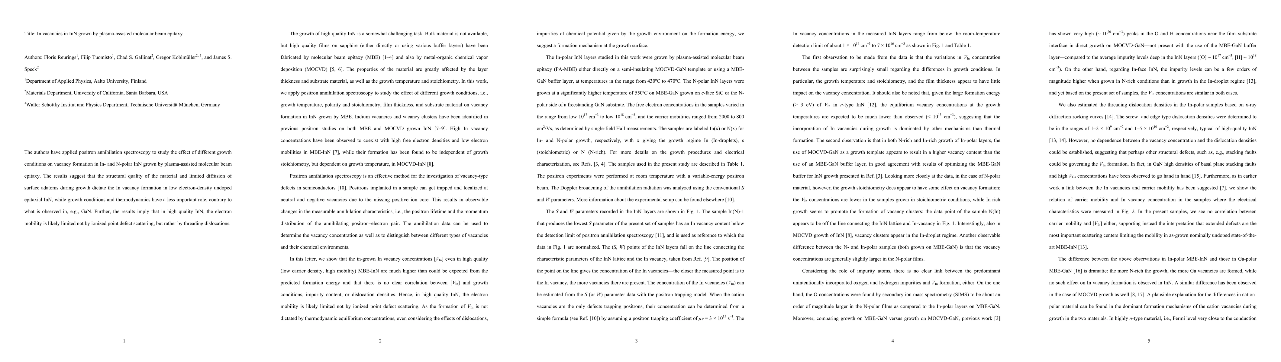 This study uses positron annihilation spectroscopy to investigate the impact of growth conditions on vacancy formation in InN grown via plasma-assisted molecular beam epitaxy, revealing that structural quality and surface adatom diffusion are key factors in In vacancy formation, with threading dislocations likely limiting electron mobility.