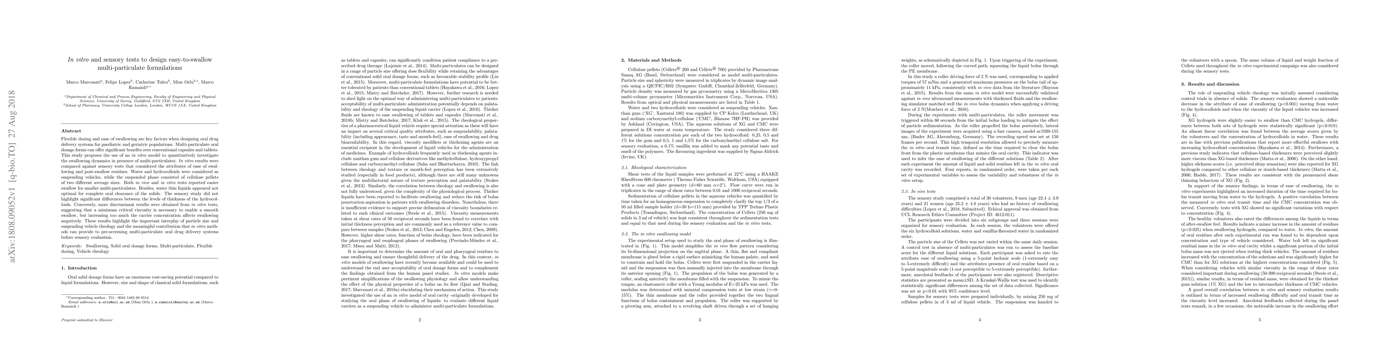 This study investigates the design of easy-to-swallow multi-particulate formulations for pediatric and geriatric populations using in vitro models and sensory tests. Results indicate smaller particles and a minimum critical viscosity in suspending vehicles facilitate easier swallowing, underscoring the value of in vitro methods for pre-screening formulations.