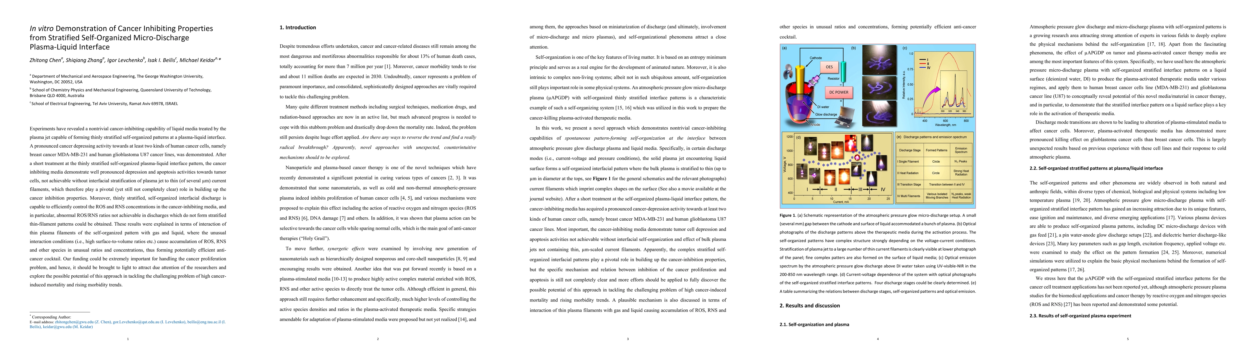 This study demonstrates that plasma-liquid interfaces with thinly stratified self-organized patterns exhibit significant cancer-inhibiting properties against breast cancer and glioblastoma cells, likely due to controlled ROS and RNS concentrations. The unique interaction conditions at these interfaces create an effective anti-cancer environment.