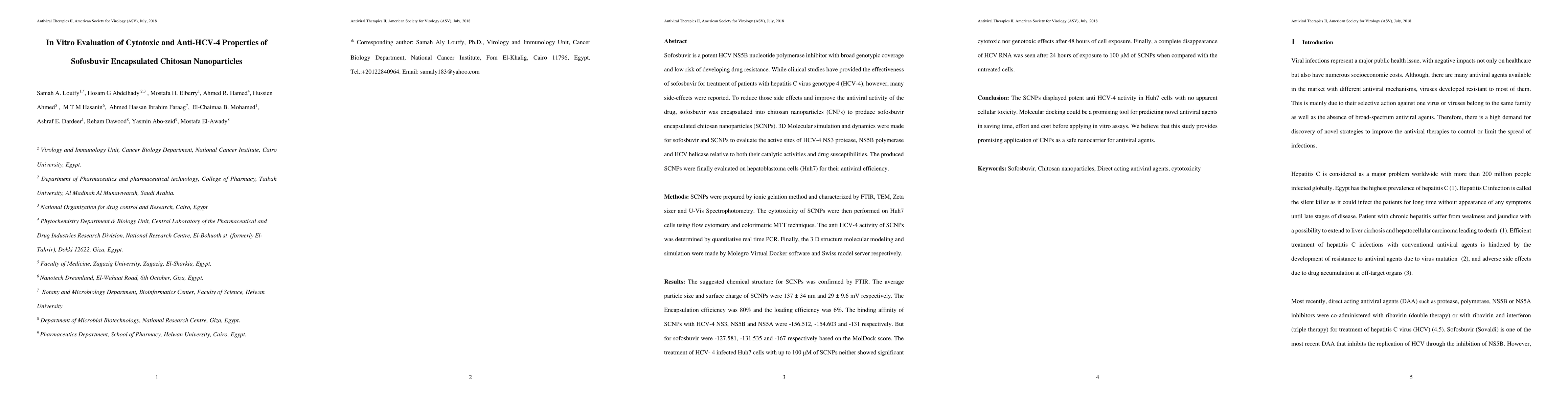 This study encapsulates sofosbuvir in chitosan nanoparticles (SCNPs) to enhance its antiviral efficacy against HCV-4 and reduce side effects. SCNPs demonstrated high binding affinity to HCV-4 targets and showed no cytotoxicity in Huh7 cells, achieving complete HCV RNA elimination without genotoxic effects.