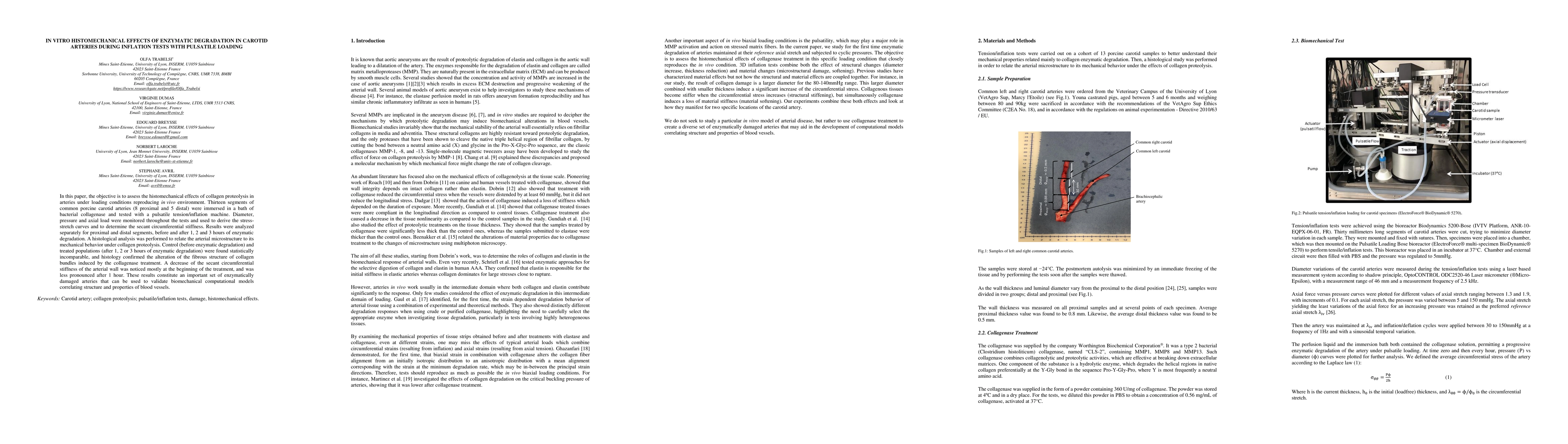 In this paper, the objective is to assess the histomechanical effects of collagen proteolysis in arteries under loading conditions reproducing in vivo environment. Thirteen segments of common porcine carotid arteries (8 proximal and 5 distal) were immersed in a bath of bacterial collagenase and tested with a pulsatile tension/inflation machine. Diameter, pressure and axial load were monitored throughout the tests and used to derive the stress-stretch curves and to determine the secant circumferential stiffness. Results were analyzed separately for proximal and distal segments, before and after 1, 2 and 3 hours of enzymatic degradation. A histological analysis was performed to relate the arterial microstructure to its mechanical behavior under collagen proteolysis. Control (before enzymatic degradation) and treated populations (after 1, 2 or 3 hours of enzymatic degradation) were found statistically incomparable, and histology confirmed the alteration of the fibrous structure of collagen bundles induced by the collagenase treatment. A decrease of the secant circumferential stiffness of the arterial wall was noticed mostly at the beginning of the treatment, and was less pronounced after 1 hour. These results constitute an important set of enzymatically damaged arteries that can be used to validate biomechanical computational models correlating structure and properties of blood vessels.