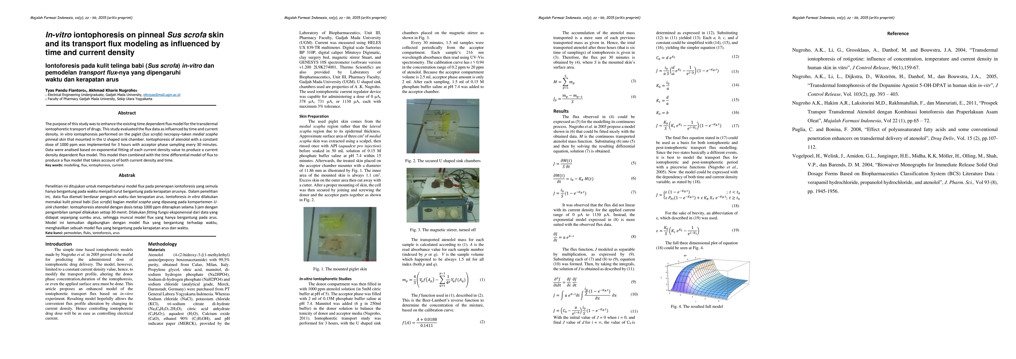 The purpose of this study was to enhance the existing time dependent flux model for the transdermal iontophoretic transport of drugs. This study evaluated the flux data as influenced by time and current density. In vitro iontophoresis performed on the piglet (Sus scrofa) necropsy-taken medial scapha pinneal skin that mounted in the U shaped sink chamber. Iontophoresis of atenolol with a constant dose of 1000 ppm was implemented for 3 hours with acceptor phase sampling every 30 minutes. Data were analised based on exponential fitting of each current density value to produce a current density dependent flux model. This model then combined with the time differential model of flux to produce a flux model that takes account of both current density and time.