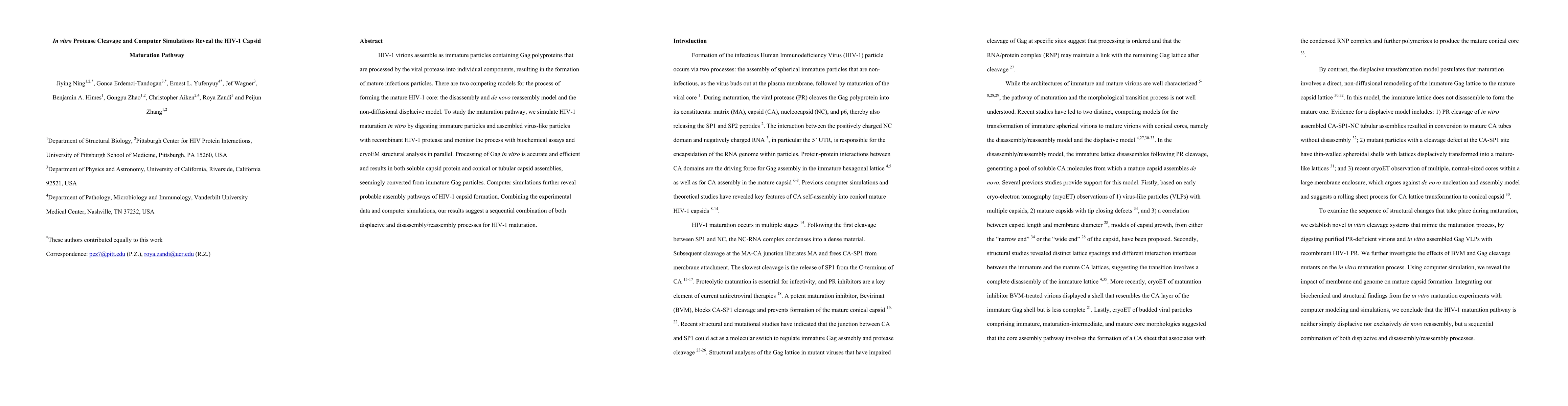 This study combines in vitro protease cleavage and computer simulations to elucidate the HIV-1 capsid maturation pathway, revealing a sequential combination of both displacive and disassembly/reassembly processes for the formation of mature, infectious viral particles. Experimental and computational data suggest a hybrid model for HIV-1 core maturation.