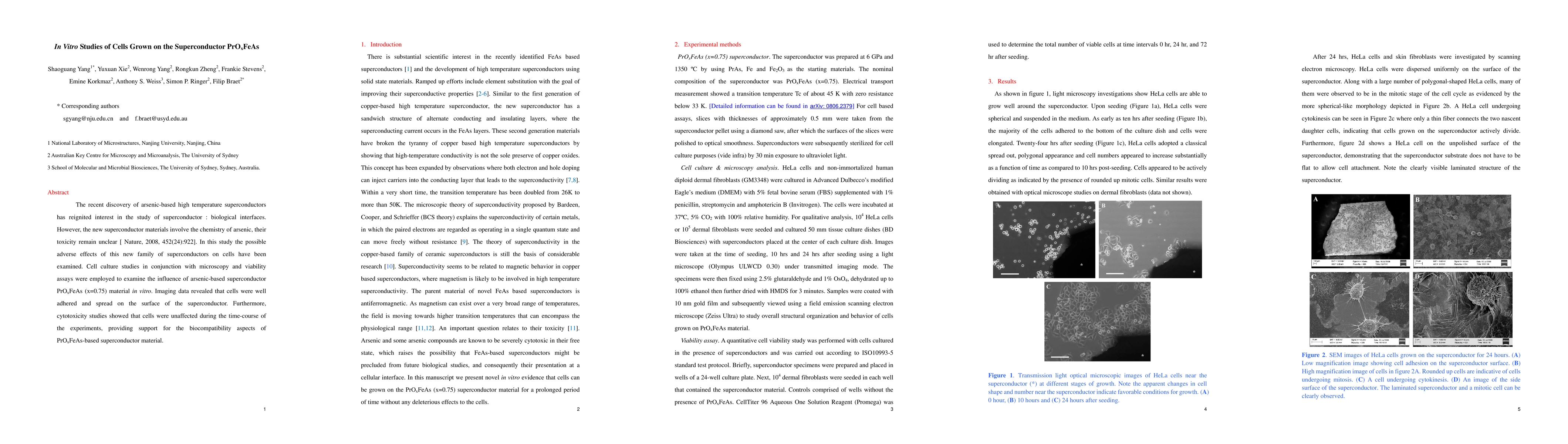 The recent discovery of arsenic-based high temperature superconductors has reignited interest in the study of superconductor : biological interfaces. However, the new superconductor materials involve the chemistry of arsenic, their toxicity remain unclear [ Nature, 2008, 452(24):922]. In this study the possible adverse effects of this new family of superconductors on cells have been examined. Cell culture studies in conjunction with microscopy and viability assays were employed to examine the influence of arsenic-based superconductor PrOxFeAs (x=0.75) material in vitro. Imaging data revealed that cells were well adhered and spread on the surface of the superconductor. Furthermore, cytotoxicity studies showed that cells were unaffected during the time-course of the experiments, providing support for the biocompatibility aspects of PrOxFeAs-based superconductor material.