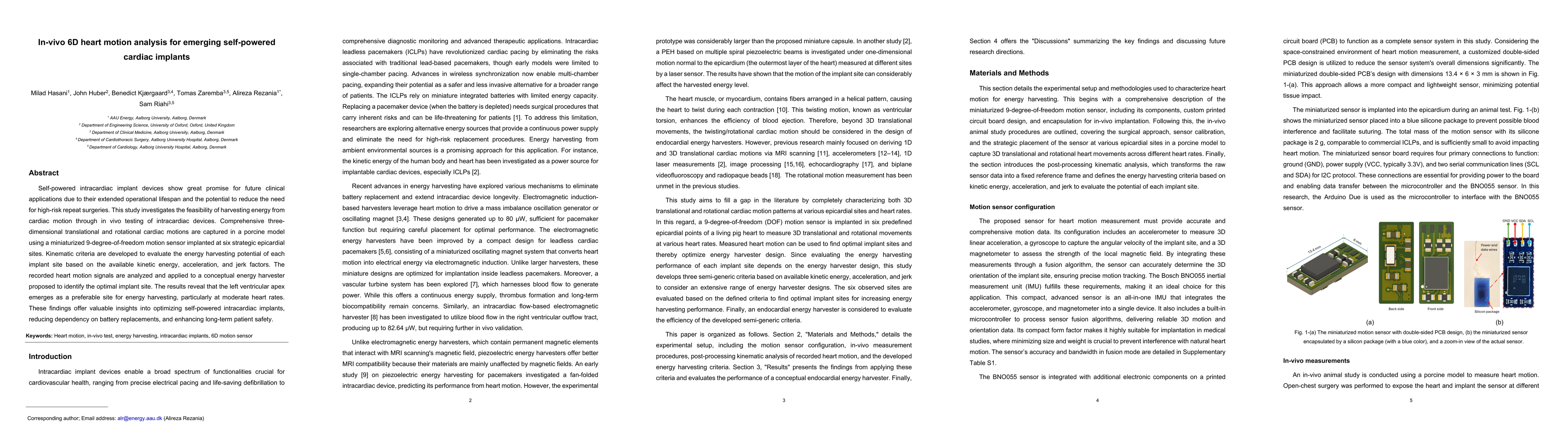 Self-powered intracardiac implant devices show great promise for future clinical applications due to their extended operational lifespan and the potential to reduce the need for high-risk repeat surgeries. This study investigates the feasibility of harvesting energy from cardiac motion through in vivo testing of intracardiac devices. Comprehensive three-dimensional translational and rotational cardiac motions are captured in a porcine model using a miniaturized 9-degree-of-freedom motion sensor implanted at six strategic epicardial sites. Kinematic criteria are developed to evaluate the energy harvesting potential of each implant site based on the available kinetic energy, acceleration, and jerk factors. The recorded heart motion signals are analyzed and applied to a conceptual energy harvester proposed to identify the optimal implant site. The results reveal that the left ventricular apex emerges as a preferable site for energy harvesting, particularly at moderate heart rates. These findings offer valuable insights into optimizing self-powered intracardiac implants, reducing dependency on battery replacements, and enhancing long-term patient safety.