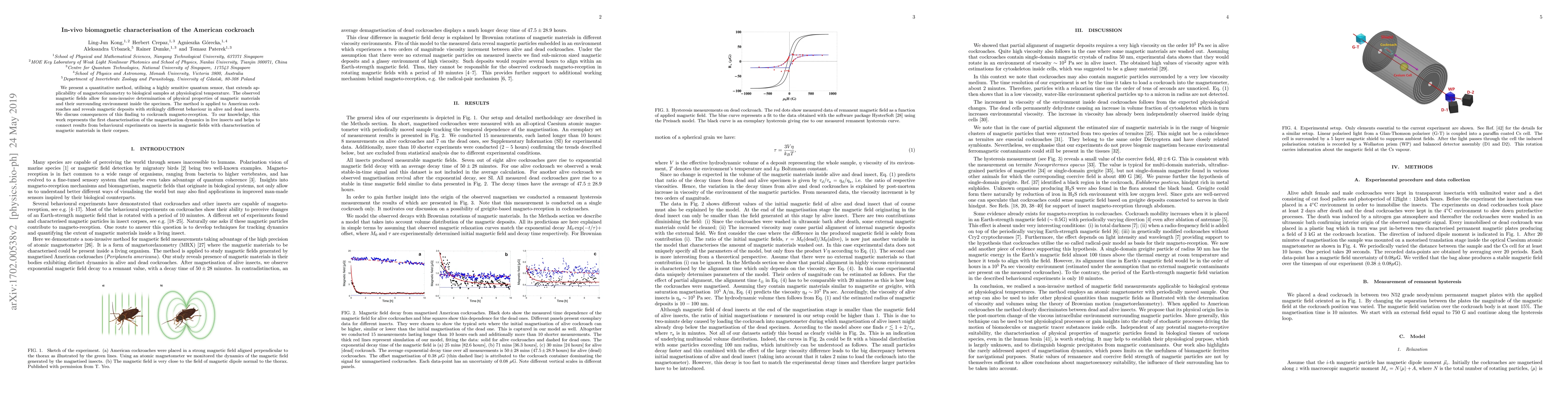 We present a quantitative method, utilising a highly sensitive quantum sensor, that extends applicability of magnetorelaxometry to biological samples at physiological temperature. The observed magnetic fields allow for non-invasive determination of physical properties of magnetic materials and their surrounding environment inside the specimen. The method is applied to American cockroaches and reveals magnetic deposits with strikingly different behaviour in alive and dead insects. We discuss consequences of this finding to cockroach magneto-reception. To our knowledge, this work represents the first characterisation of the magnetisation dynamics in live insects and helps to connect results from behavioural experiments on insects in magnetic fields with characterisation of magnetic materials in their corpses.