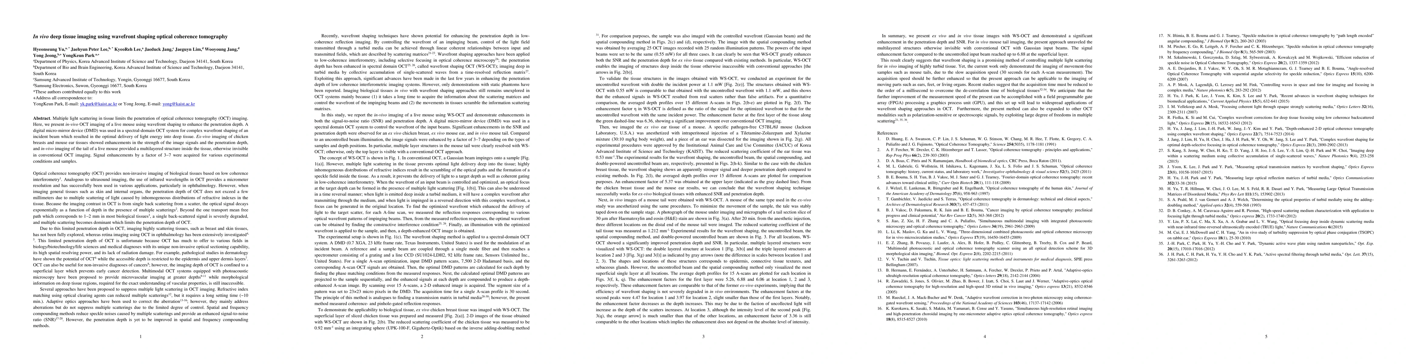 This paper presents an enhanced in vivo optical coherence tomography (OCT) imaging technique using wavefront shaping to overcome multiple light scattering in tissue, achieving improved penetration depth and signal strength. The method, employing a digital micro-mirror device (DMD) in a spectral-domain OCT system, demonstrated significant signal enhancements (3-7 times) and deeper imaging capabilities in both ex-vivo and in-vivo samples.