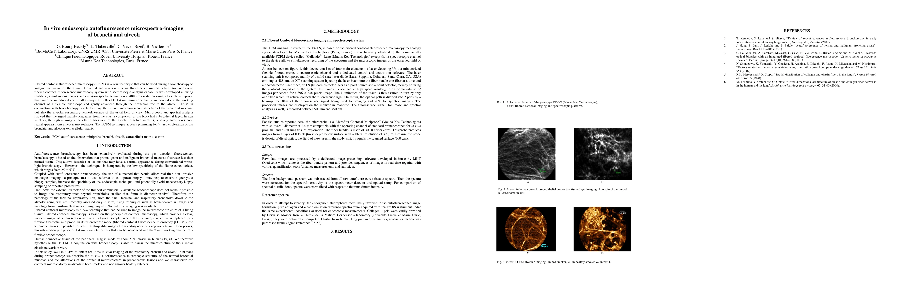 Fibered confocal fluorescence microscopy (FCFM) is a new technique that can be used during a bronchoscopy to analyze the nature of the human bronchial and alveolar mucosa fluorescence microstructure. An endoscopic fibered confocal fluorescence microscopy system with spectroscopic analysis capability was developed allowing real-time, simultaneous images and emission spectra acquisition at 488 nm excitation using a flexible miniprobe that could be introduced into small airways. This flexible 1.4 mm miniprobe can be introduced into the working channel of a flexible endoscope and gently advanced through the bronchial tree to the alveoli. FCFM in conjunction with bronchoscopy is able to image the in vivo autofluorescence structure of the bronchial mucosae but also the alveolar respiratory network outside of the usual field of view. Microscopic and spectral analysis showed that the signal mainly originates from the elastin component of the bronchial subepithelial layer. In non smokers, the system images the elastin backbone of the aveoli. In active smokers, a strong autofluorescence signal appears from alveolar macrophages. The FCFM technique appears promising for in vivo exploration of the bronchial and alveolar extracellular matrix.