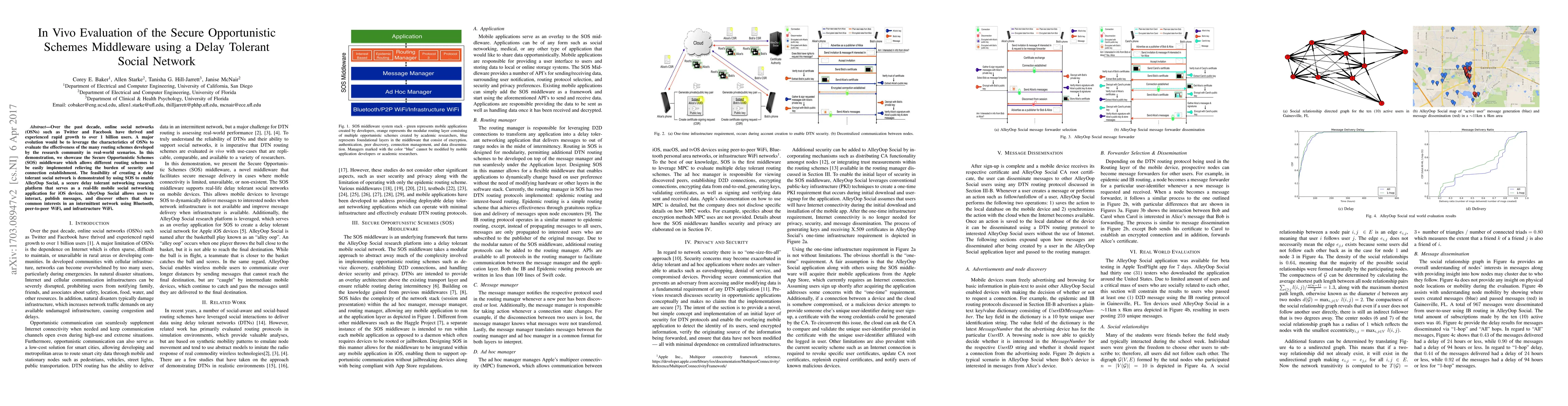 This paper evaluates the Secure Opportunistic Schemes (SOS) middleware in real-world scenarios using a delay tolerant social network, demonstrating its effectiveness in a mobile social networking application called AlleyOop Social for iOS devices. SOS facilitates secure, flexible routing schemes and connection establishment in intermittent networks.