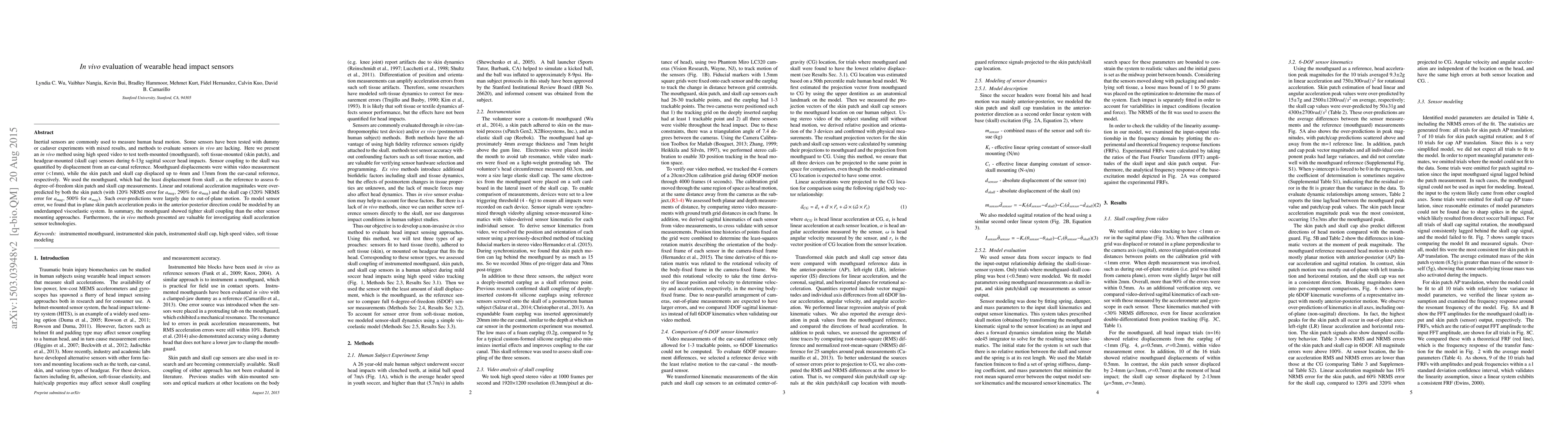 Inertial sensors are commonly used to measure human head motion. Some sensors have been validated with dummy or cadaver experiments, but methods to evaluate sensors in vivo are lacking. Here we present an in vivo method using high speed video to evaluate teeth-mounted (mouthguard), soft tissue-mounted (skin patch), and headgear-mounted (skull cap) sensors during 6-13g sagittal soccer head impacts. Sensor coupling to the skull is quantified by displacement from an ear-canal reference. Mouthguard displacements were within video measurement error (<1mm), while the skin patch and skull cap displaced up to 4mm and 13mm from the ear-canal reference, respectively. We used the mouthguard, which had the least displacement from skull, as the reference to assess 6-degree-of-freedom skin patch and skull cap measurements. Linear and rotational acceleration magnitudes were over-predicted by both the skin patch (with 120% NRMS error for a_mag, 290% for alpha_mag) and the skull cap (320% NRMS error for a_mag, 500% for alpha_mag). Such over-predictions were largely due to out-of-plane motion. To model sensor error, we found that in-plane acceleration peaks from the skin patch in the anterior-posterior direction could be modeled by an underdamped viscoelastic system. In summary, the mouthguard showed tighter skull coupling in vivo than the other sensors. Furthermore, the in vivo methods presented are valuable for investigating skull acceleration sensor technologies.