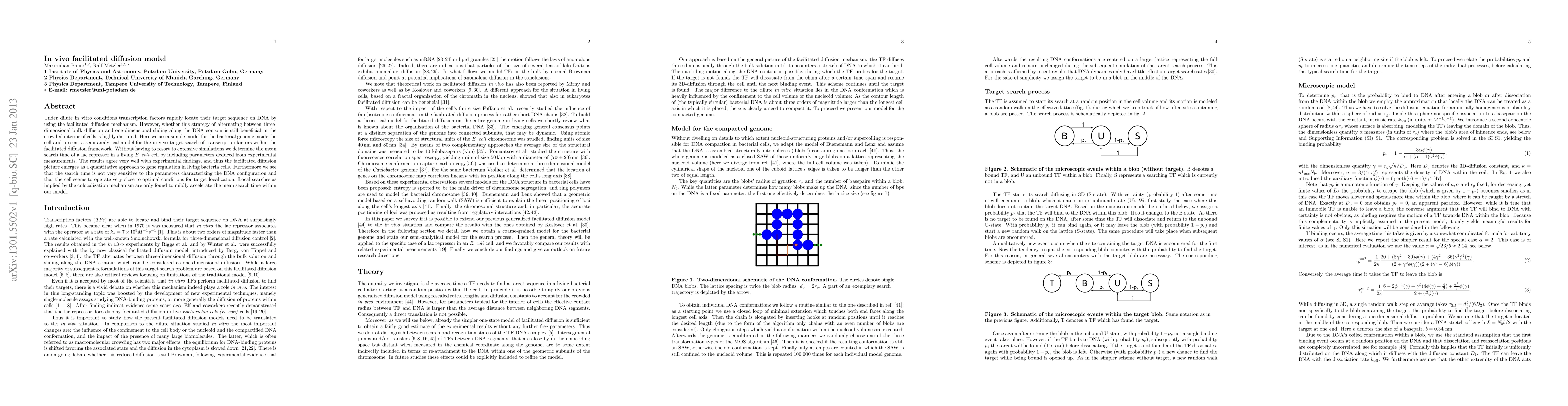 This paper develops a semi-analytical model to study the facilitated diffusion mechanism of transcription factors in vivo, showing that it effectively predicts the mean search time for a lac repressor in E. coli cells, aligning well with experimental data. The model indicates that cells operate near optimal conditions for target localization, with local searches providing only a minor acceleration.