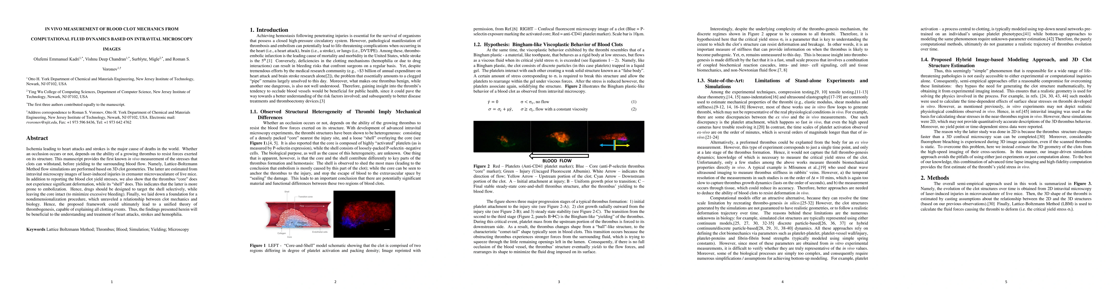 This paper presents the first in vivo measurement of blood clot mechanics using computational fluid dynamics based on intravital microscopy. It reveals that clot shells are more prone to deformation and embolization, suggesting targeted drug design to minimize excessive bleeding while preserving clot cores.
