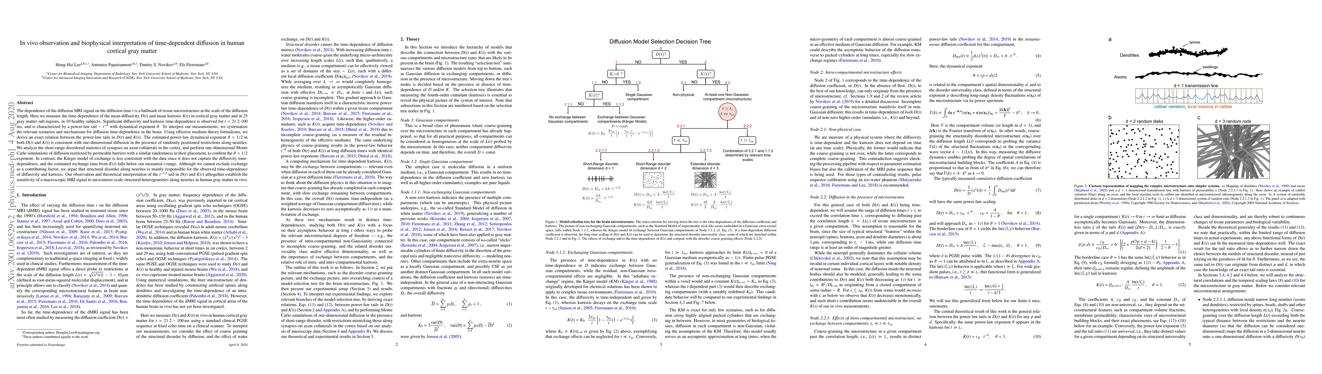 This study investigates the time-dependent diffusion in human cortical gray matter using MRI, observing significant changes in mean diffusivity and kurtosis over 21.2-100 ms. Theoretical analysis suggests that the observed $t^{-1/2}$ power-law tail is primarily due to structural disorder along neurites rather than exchange processes.