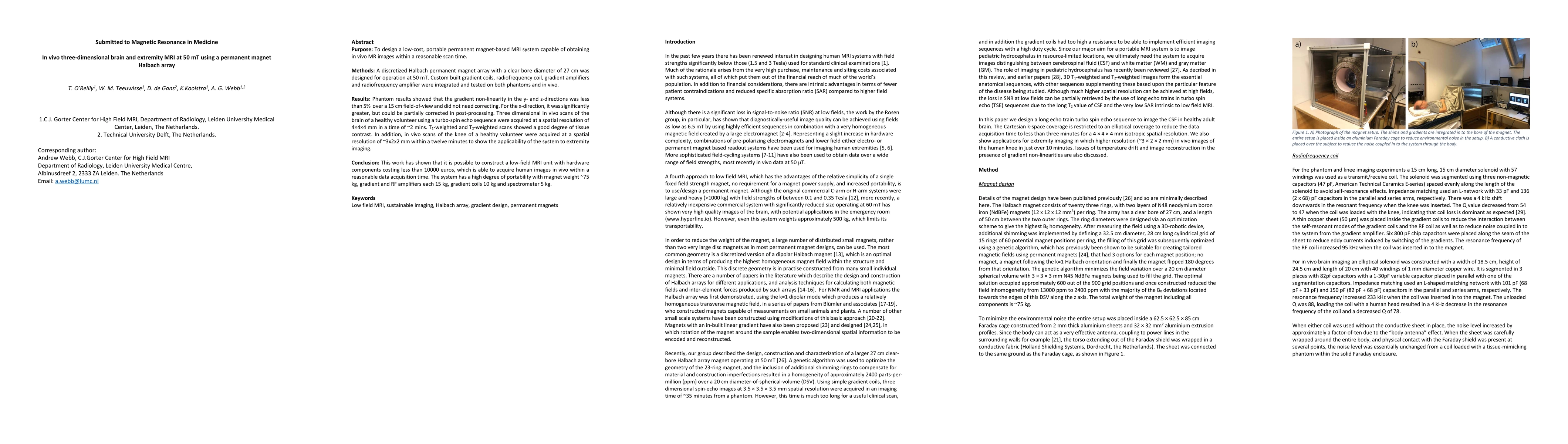 This study developed a low-cost, portable MRI system using a permanent magnet Halbach array operating at 50 mT, achieving 3D brain and knee scans in ~2 and 12 minutes respectively, demonstrating feasibility and portability of the low-field MRI unit.