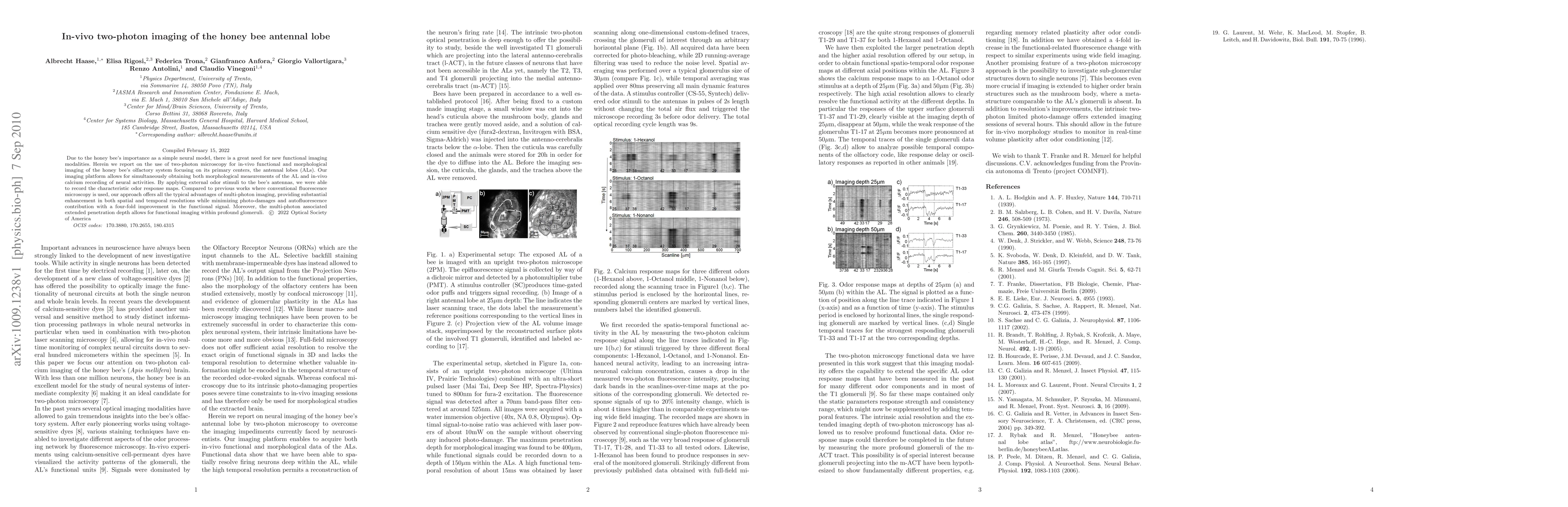 This paper presents a novel two-photon microscopy technique for in-vivo imaging of the honey bee's antennal lobe, achieving high spatial and temporal resolution while minimizing photo-damage, and enabling detailed odor response mapping. The method provides a four-fold improvement in functional signal compared to conventional fluorescence microscopy.