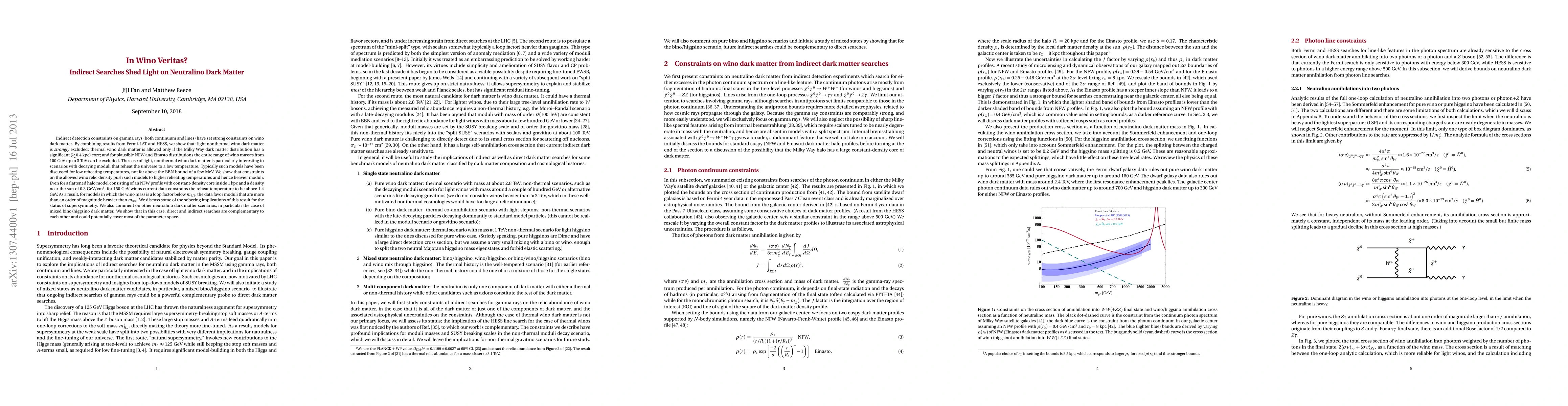 This research uses indirect detection data from gamma rays to strongly exclude light nonthermal wino dark matter and restrict wino masses up to 3 TeV. For thermal wino dark matter, it requires a Milky Way dark matter core greater than 0.4 kpc. Current constraints push models with decaying moduli to higher reheating temperatures, favoring heavier moduli than gravitinos, which has implications for supersymmetry. Direct and indirect searches are complementary for mixed bino/higgsino dark matter scenarios.