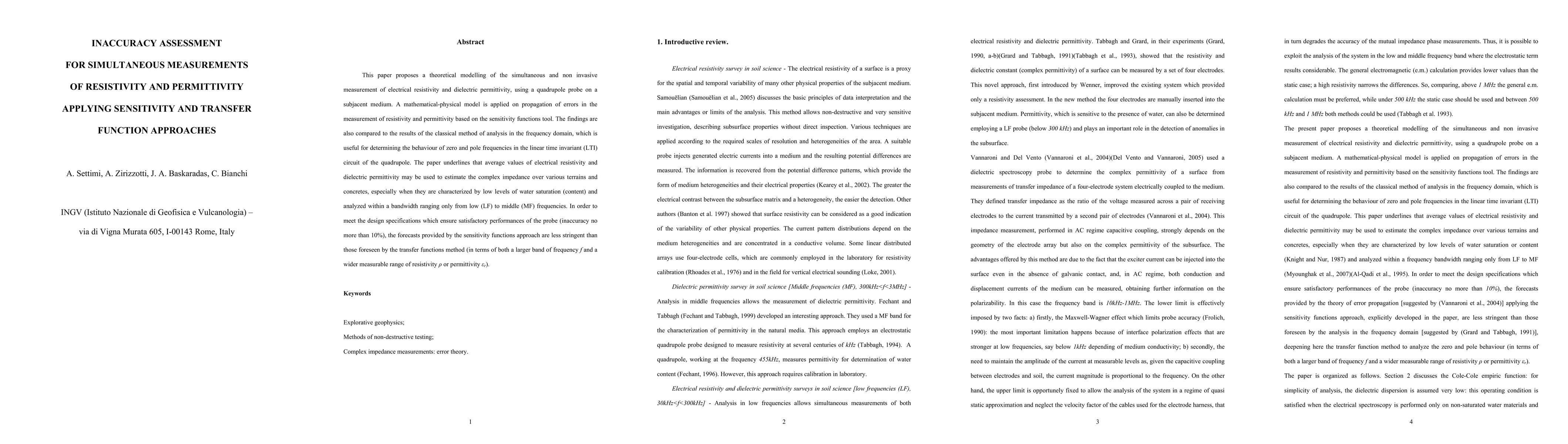 This paper proposes a theoretical modelling of the simultaneous and non invasive measurement of electrical resistivity and dielectric permittivity, using a quadrupole probe on a subjacent medium. A mathematical-physical model is applied on propagation of errors in the measurement of resistivity and permittivity based on the sensitivity functions tool. The findings are also compared to the results of the classical method of analysis in the frequency domain, which is useful for determining the behaviour of zero and pole frequencies in the linear time invariant (LTI) circuit of the quadrupole. The paper underlines that average values of electrical resistivity and dielectric permittivity may be used to estimate the complex impedance over various terrains and concretes, especially when they are characterized by low levels of water saturation (content) and analyzed within a bandwidth ranging only from low (LF) to middle (MF) frequencies. In order to meet the design specifications which ensure satisfactory performances of the probe (inaccuracy no more than 10%), the forecasts provided by the sensitivity functions approach are less stringent than those foreseen by the transfer functions method (in terms of both a larger band of frequency f and a wider measurable range of resistivity or permittivity).