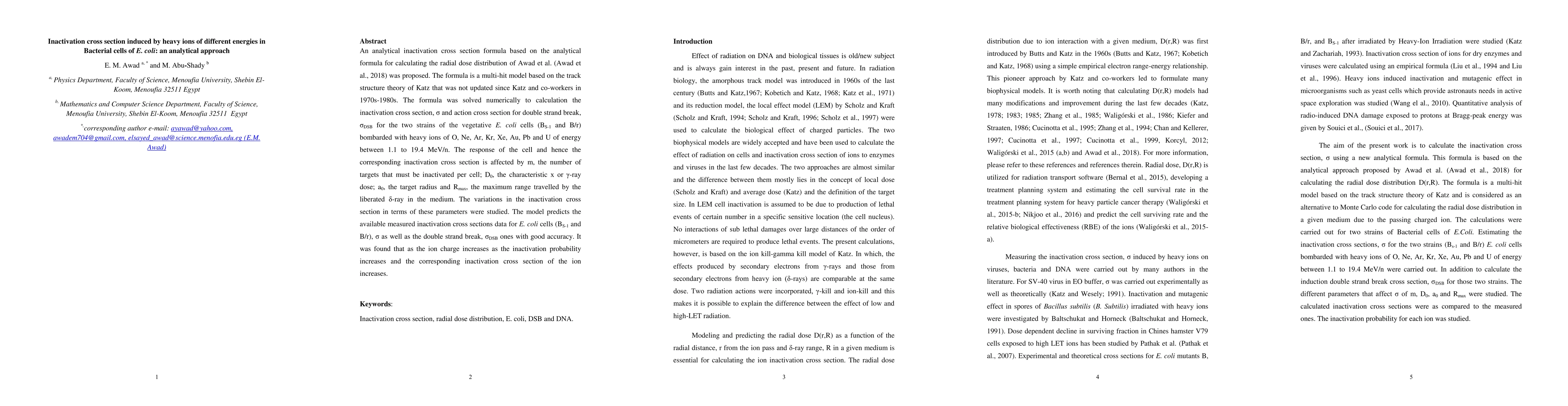This paper proposes an analytical inactivation cross section formula based on track structure theory to calculate the inactivation and double strand break cross sections for E. coli cells exposed to heavy ions of varying energies. The model accurately predicts measured data and shows that inactivation probability and cross section increase with higher ion charge.