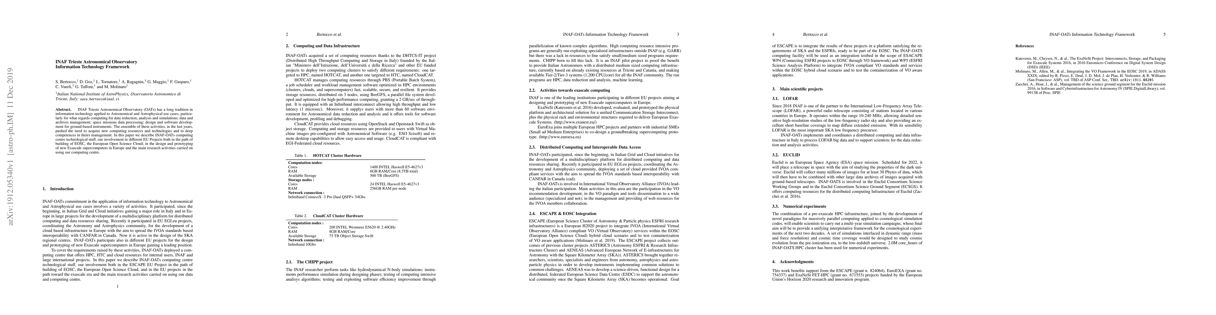 INAF Trieste Astronomical Observatory (OATs) has a long tradition in information technology applied to Astronomical and Astrophysical use cases, particularly for what regards computing for data reduction, analysis and simulations; data and archives management; space missions data processing; design and software development for ground-based instruments. The ensemble of these activities, in the last years, pushed the need to acquire new computing resources and technologies and to deep competences in theirs management. In this paper we describe INAF-OATs computing centre technological stuff, our involvement in different EU Projects both in the path of building of EOSC, the European Open Science Cloud; in the design and prototyping of new Exascale supercomputers in Europe and the main research activities carried on using our computing centre.