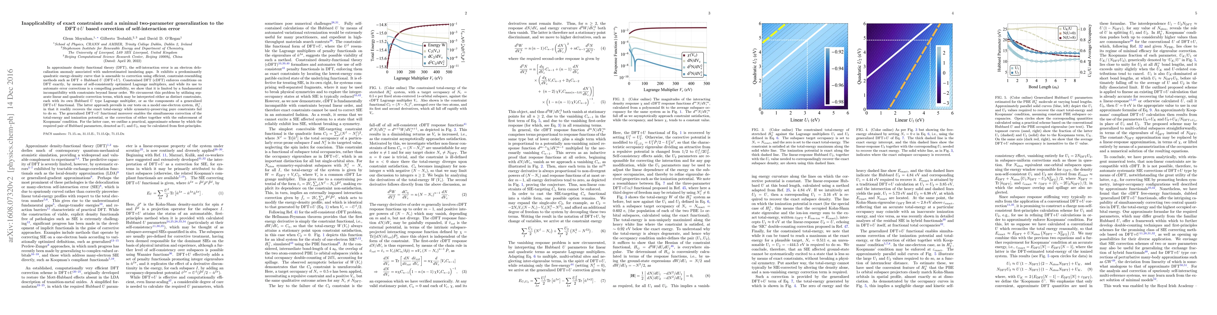 This paper demonstrates that exact constraints in DFT+$U$ cannot correct self-interaction errors beyond linear order. Instead, a two-parameter generalization of DFT+$U$ using separate linear and quadratic correction terms effectively corrects these errors, as shown in tests on $H_2^+$.