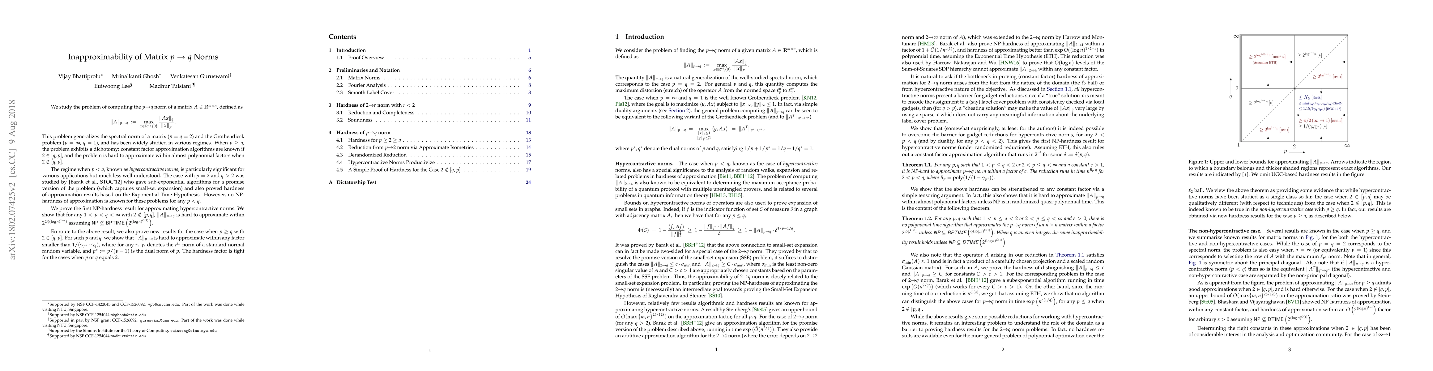 We study the problem of computing the $p\rightarrow q$ norm of a matrix $A \in R^{m \times n}$, defined as \[ \|A\|_{p\rightarrow q} ~:=~ \max_{x \,\in\, R^n \setminus \{0\}} \frac{\|Ax\|_q}{\|x\|_p} \] This problem generalizes the spectral norm of a matrix ($p=q=2$) and the Grothendieck problem ($p=\infty$, $q=1$), and has been widely studied in various regimes. When $p \geq q$, the problem exhibits a dichotomy: constant factor approximation algorithms are known if $2 \in [q,p]$, and the problem is hard to approximate within almost polynomial factors when $2 \notin [q,p]$. The regime when $p < q$, known as \emph{hypercontractive norms}, is particularly significant for various applications but much less well understood. The case with $p = 2$ and $q > 2$ was studied by [Barak et al, STOC'12] who gave sub-exponential algorithms for a promise version of the problem (which captures small-set expansion) and also proved hardness of approximation results based on the Exponential Time Hypothesis. However, no NP-hardness of approximation is known for these problems for any $p < q$. We study the hardness of approximating matrix norms in both the above cases and prove the following results: - We show that for any $1< p < q < \infty$ with $2 \notin [p,q]$, $\|A\|_{p\rightarrow q}$ is hard to approximate within $2^{O(\log^{1-\epsilon}\!n)}$ assuming $NP \not\subseteq BPTIME(2^{\log^{O(1)}\!n})$. This suggests that, similar to the case of $p \geq q$, the hypercontractive setting may be qualitatively different when $2$ does not lie between $p$ and $q$. - For all $p \geq q$ with $2 \in [q,p]$, we show $\|A\|_{p\rightarrow q}$ is hard to approximate within any factor than $1/(\gamma_{p^*} \cdot \gamma_q)$, where for any $r$, $\gamma_r$ denotes the $r^{th}$ norm of a gaussian, and $p^*$ is the dual norm of $p$.