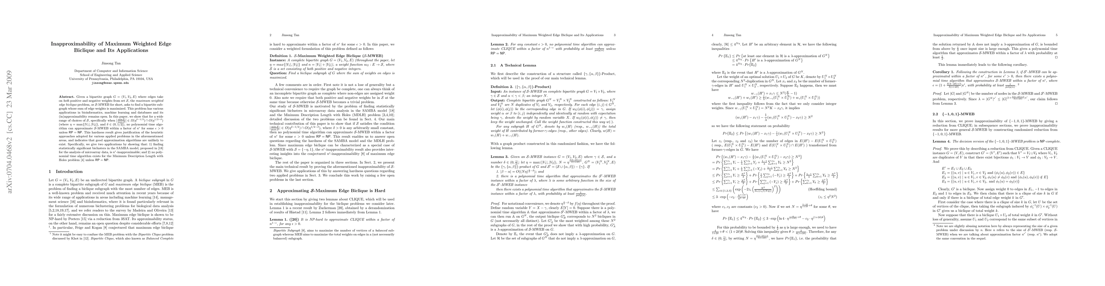 Given a bipartite graph $G = (V_1,V_2,E)$ where edges take on {\it both} positive and negative weights from set $\mathcal{S}$, the {\it maximum weighted edge biclique} problem, or $\mathcal{S}$-MWEB for short, asks to find a bipartite subgraph whose sum of edge weights is maximized. This problem has various applications in bioinformatics, machine learning and databases and its (in)approximability remains open. In this paper, we show that for a wide range of choices of $\mathcal{S}$, specifically when $| \frac{\min\mathcal{S}} {\max \mathcal{S}} | \in \Omega(\eta^{\delta-1/2}) \cap O(\eta^{1/2-\delta})$ (where $\eta = \max\{|V_1|, |V_2|\}$, and $\delta \in (0,1/2]$), no polynomial time algorithm can approximate $\mathcal{S}$-MWEB within a factor of $n^{\epsilon}$ for some $\epsilon > 0$ unless $\mathsf{RP = NP}$. This hardness result gives justification of the heuristic approaches adopted for various applied problems in the aforementioned areas, and indicates that good approximation algorithms are unlikely to exist. Specifically, we give two applications by showing that: 1) finding statistically significant biclusters in the SAMBA model, proposed in \cite{Tan02} for the analysis of microarray data, is $n^{\epsilon}$-inapproximable; and 2) no polynomial time algorithm exists for the Minimum Description Length with Holes problem \cite{Bu05} unless $\mathsf{RP=NP}$.
