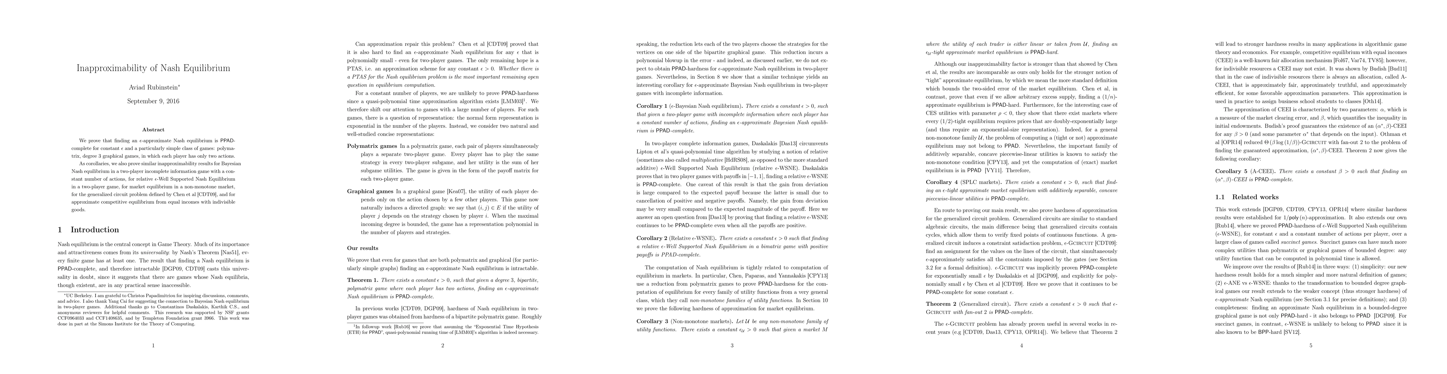 We prove that finding an $\epsilon$-approximate Nash equilibrium is PPAD-complete for constant $\epsilon$ and a particularly simple class of games: polymatrix, degree 3 graphical games, in which each player has only two actions. As corollaries, we also prove similar inapproximability results for Bayesian Nash equilibrium in a two-player incomplete information game with a constant number of actions, for relative $\epsilon$-Well Supported Nash Equilibrium in a two-player game, for market equilibrium in a non-monotone market, for the generalized circuit problem defined by Chen, Deng, and Teng [CDT'09], and for approximate competitive equilibrium from equal incomes with indivisible goods.