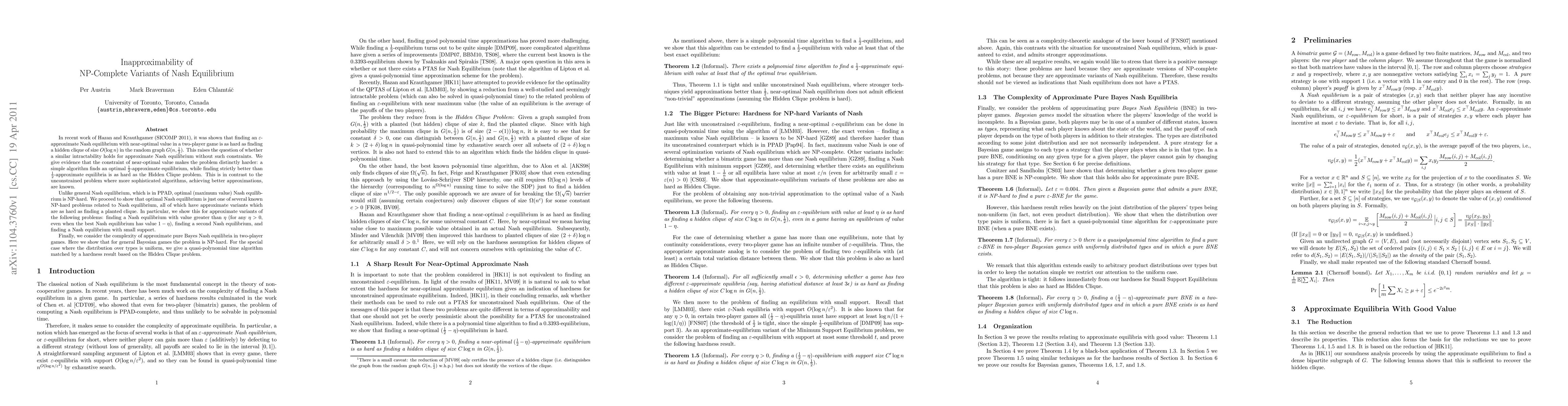 This paper demonstrates the inapproximability of various NP-hard variants of Nash equilibrium, showing that finding even slightly better than 1/2-approximations is as hard as solving the Hidden Clique problem. It contrasts the constrained problem with the unconstrained one, highlighting the difficulty of achieving near-optimal values in Nash equilibrium.