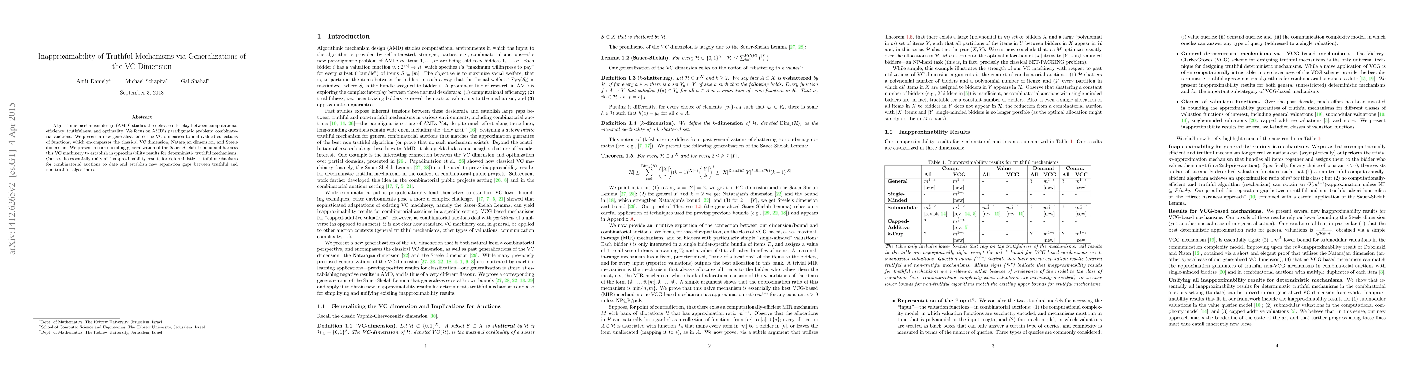The paper presents a generalized VC dimension and a corresponding Sauer-Shelah Lemma for multivalued function collections, which are then used to derive inapproximability results for deterministic truthful mechanisms.