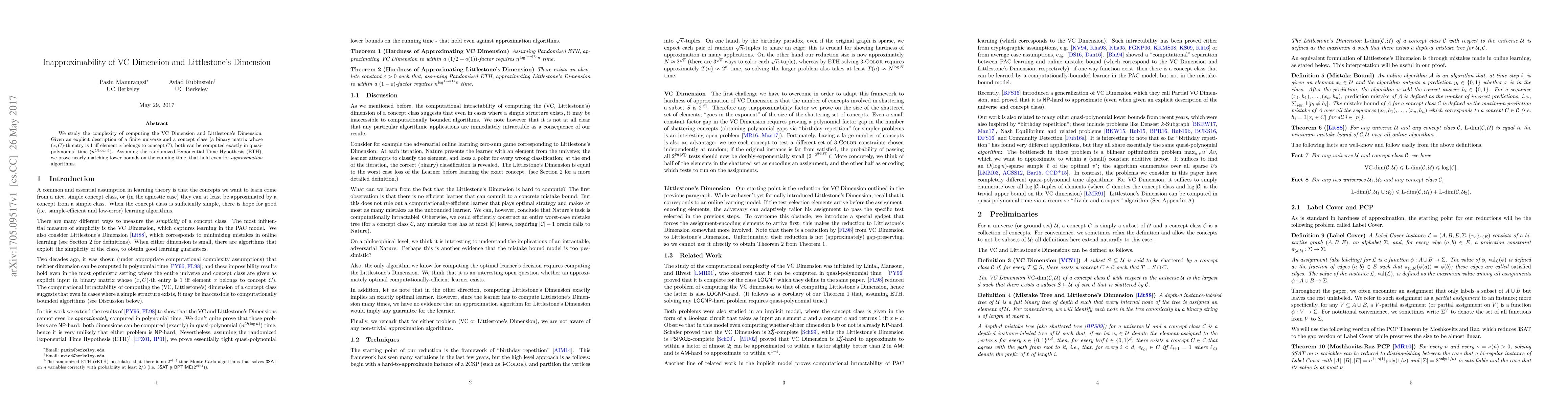 This paper demonstrates quasi-polynomial time algorithms for computing VC Dimension and Littlestone's Dimension exactly, and under the randomized ETH, it establishes nearly matching inapproximability results for these measures.