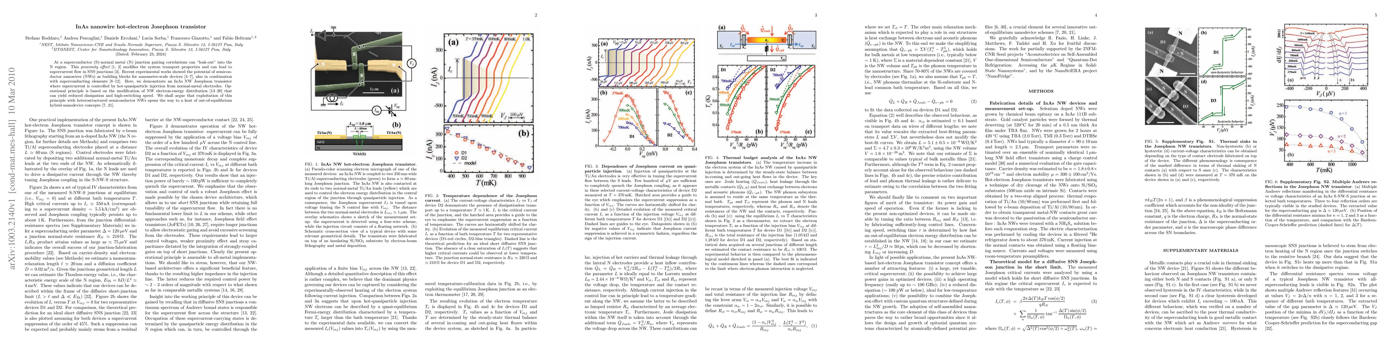 This paper demonstrates an InAs nanowire Josephson transistor where supercurrent is controlled by hot-electron injection from normal-metal electrodes, exploiting the proximity effect to modify the electron-energy distribution for reduced dissipation and high-switching speed. The potential of this concept in heterostructured semiconductor nanowires suggests a pathway to novel out-of-equilibrium hybrid-nanodevices.