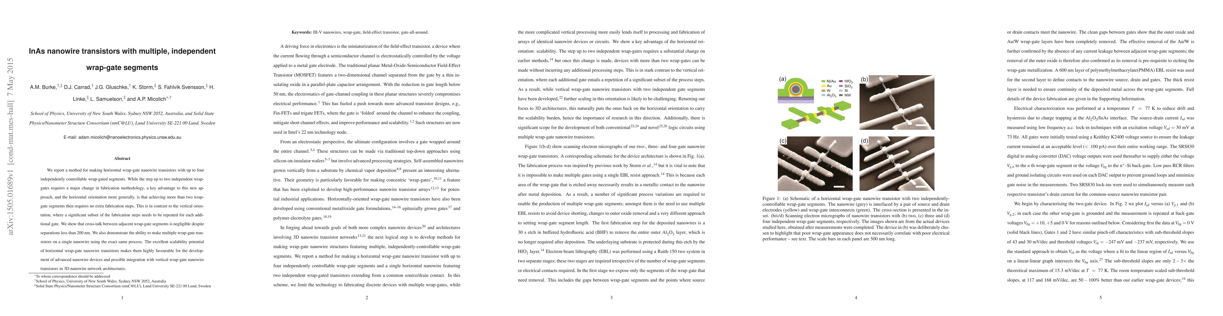 This paper describes a fabrication method for horizontal wrap-gate InAs nanowire transistors with up to four independently controllable segments, highlighting the scalability advantage over vertical designs. The technique exhibits negligible cross-talk between segments and suggests potential for advanced 3D nanowire network architectures.