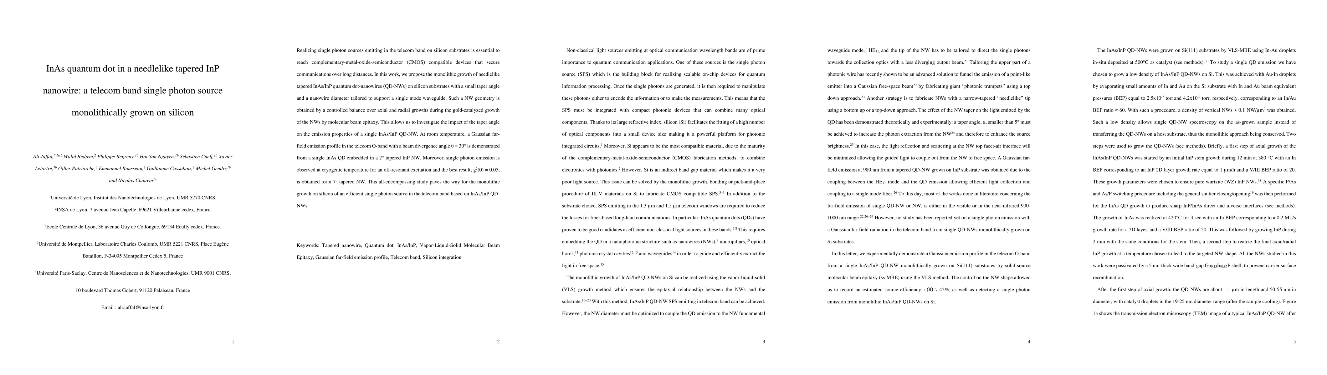 This research proposes the monolithic growth of needlelike tapered InAs/InP quantum dot-nanowires on silicon substrates to create a CMOS-compatible single photon source in the telecom band. The study demonstrates Gaussian far-field emission in the O-band at room temperature and single photon emission at cryogenic temperatures, paving the way for efficient telecom band photon sources on silicon.