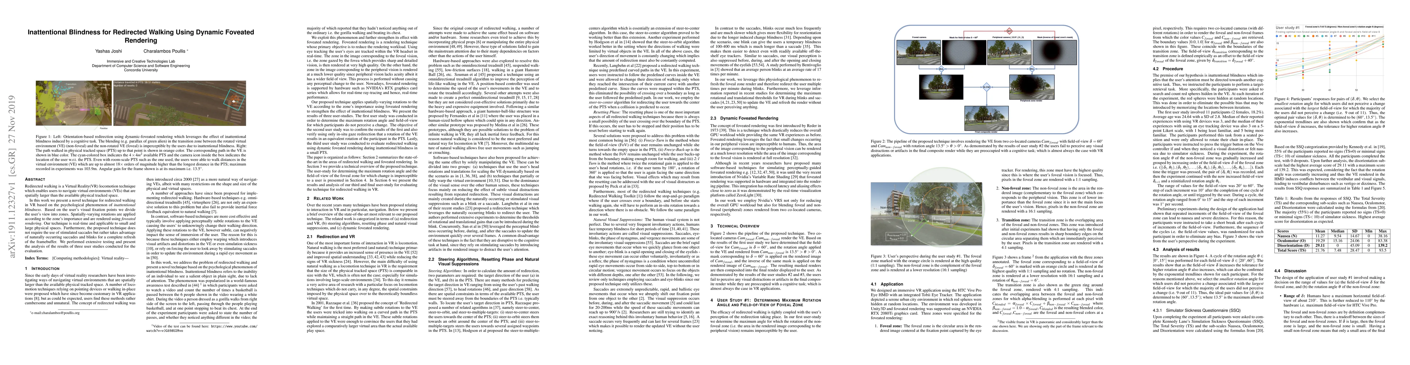 Redirected walking is a Virtual Reality(VR) locomotion technique which enables users to navigate virtual environments (VEs) that are spatially larger than the available physical tracked space. In this work we present a novel technique for redirected walking in VR based on the psychological phenomenon of inattentional blindness. Based on the user's visual fixation points we divide the user's view into zones. Spatially-varying rotations are applied according to the zone's importance and are rendered using foveated rendering. Our technique is real-time and applicable to small and large physical spaces. Furthermore, the proposed technique does not require the use of stimulated saccades but rather takes advantage of naturally occurring saccades and blinks for a complete refresh of the framebuffer. We performed extensive testing and present the analysis of the results of three user studies conducted for the evaluation.