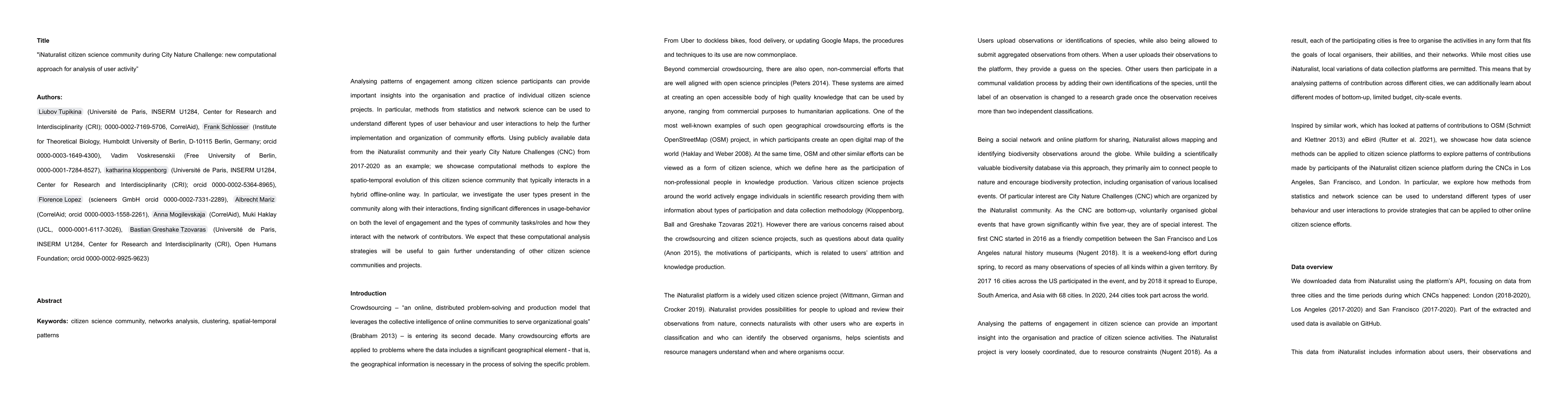 This paper uses computational methods to analyze the engagement patterns of iNaturalist citizen scientists during City Nature Challenges from 2017-2020, revealing diverse user behaviors and interactions. The study highlights the hybrid offline-online nature of community participation and offers strategies for understanding other citizen science projects.