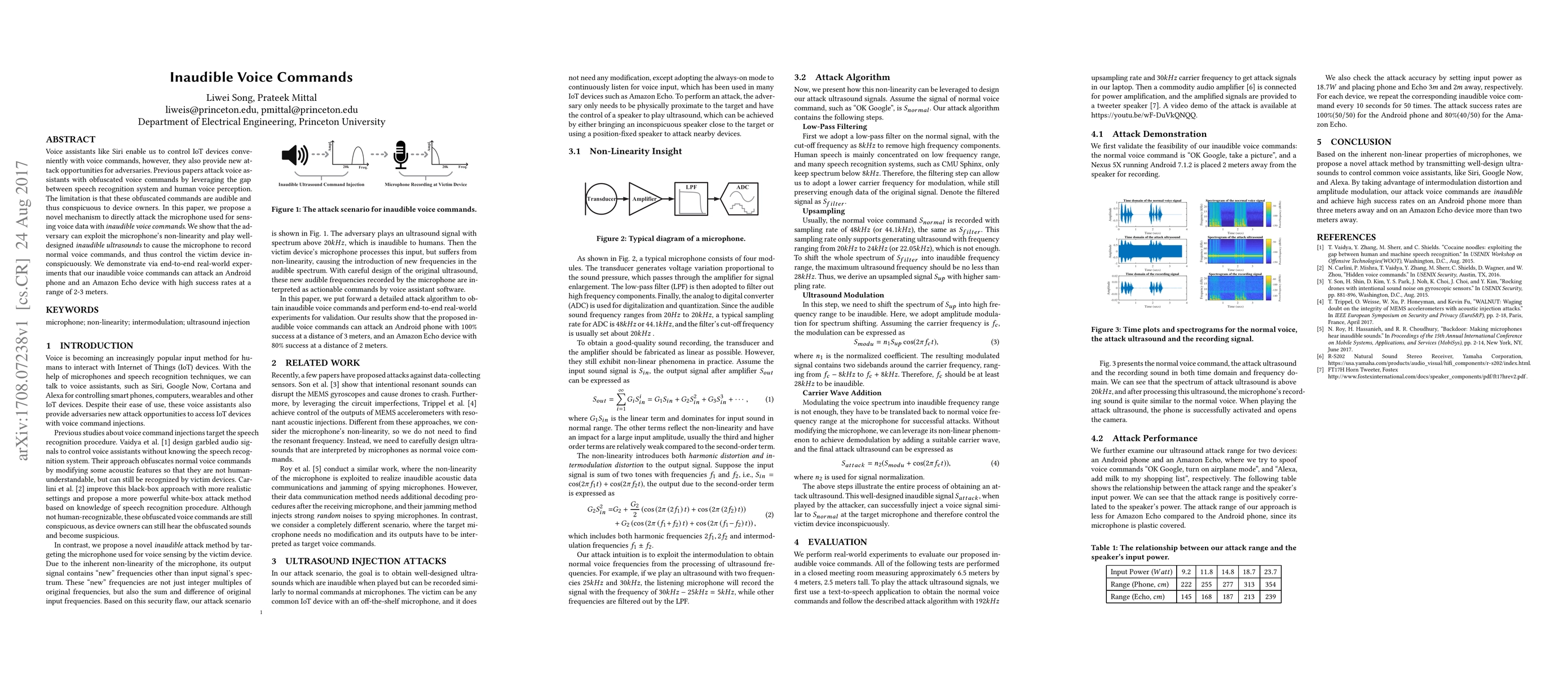 This paper proposes a novel method to attack IoT devices using inaudible ultrasound commands that exploit microphone non-linearity, allowing adversaries to control devices inconspicuously. Experiments show successful attacks on an Android phone and an Amazon Echo device at a range of 2-3 meters.
