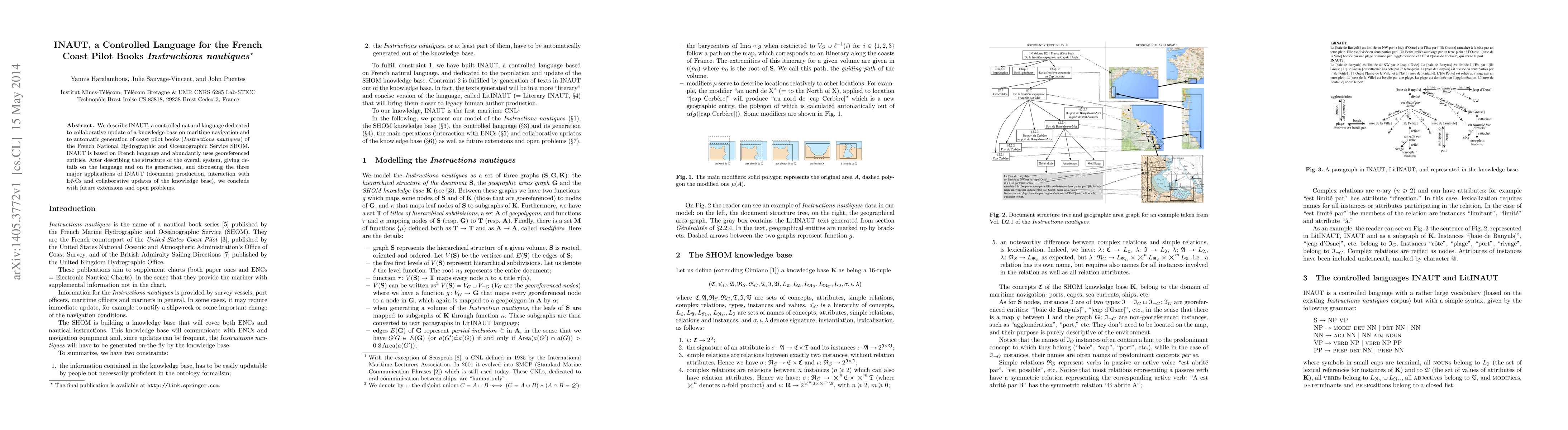 We describe INAUT, a controlled natural language dedicated to collaborative update of a knowledge base on maritime navigation and to automatic generation of coast pilot books (Instructions nautiques) of the French National Hydrographic and Oceanographic Service SHOM. INAUT is based on French language and abundantly uses georeferenced entities. After describing the structure of the overall system, giving details on the language and on its generation, and discussing the three major applications of INAUT (document production, interaction with ENCs and collaborative updates of the knowledge base), we conclude with future extensions and open problems.