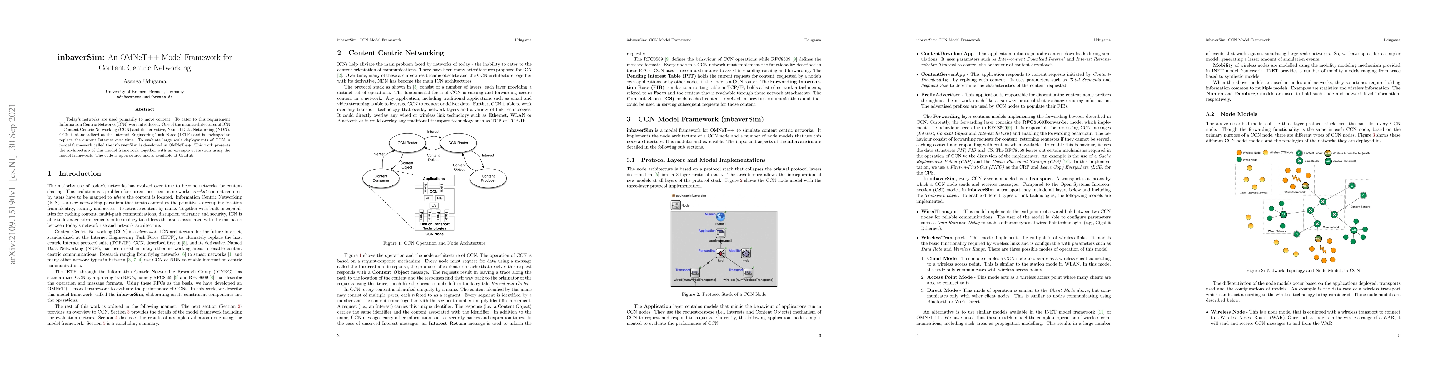 The inbaverSim framework in OMNeT++ models large-scale deployments of Content Centric Networking (CCN) for evaluating Information Centric Networks. The open-source code is available on GitHub for further research and application.