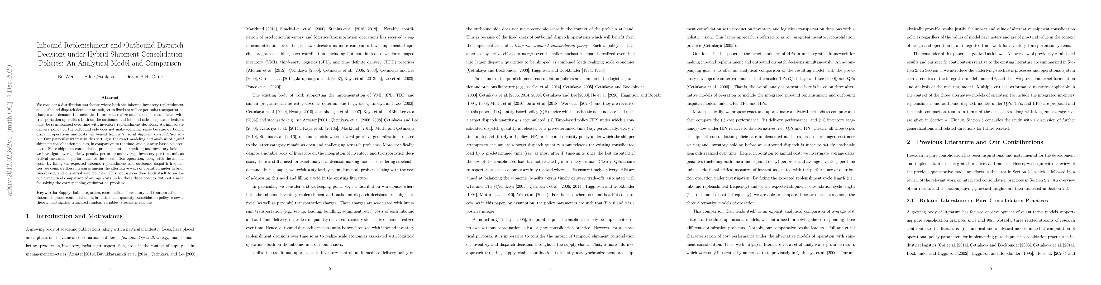 The paper develops an analytical model for hybrid shipment consolidation policies in a distribution warehouse, considering both inbound inventory replenishment and outbound dispatch decisions under fixed and per-unit transportation charges with stochastic demand.