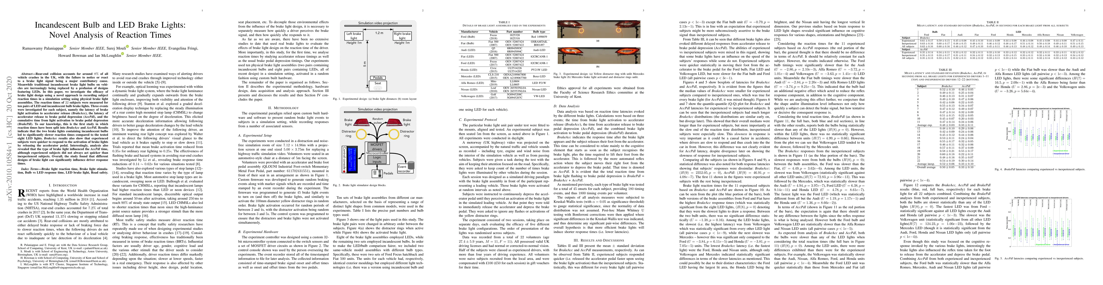 Rear-end collision accounts for around 8% of all vehicle crashes in the UK, with the failure to notice or react to a brake light signal being a major contributory cause. Meanwhile traditional incandescent brake light bulbs on vehicles are increasingly being replaced by a profusion of designs featuring LEDs. In this paper, we investigate the efficacy of brake light design using a novel approach to recording subject reaction times in a simulation setting using physical brake light assemblies. The reaction times of 22 subjects were measured for ten pairs of LED and incandescent bulb brake lights. Three events were investigated for each subject, namely the latency of brake light activation to accelerator release (BrakeAcc), the latency of accelerator release to brake pedal depression (AccPdl), and the cumulative time from light activation to brake pedal depression (BrakePdl). To our knowledge, this is the first study in which reaction times have been split into BrakeAcc and AccPdl. Results indicate that the two brake lights containing incandescent bulbs led to significantly slower reaction times compared to the tested eight LED lights. BrakeAcc results also show that experienced subjects were quicker to respond to the activation of brake lights by releasing the accelerator pedal. Interestingly, the analysis also revealed that the type of brake light influenced the AccPdl time, although experienced subjects did not always act quicker than inexperienced subjects. Overall, the study found that different designs of brake light can significantly influence driver response times.