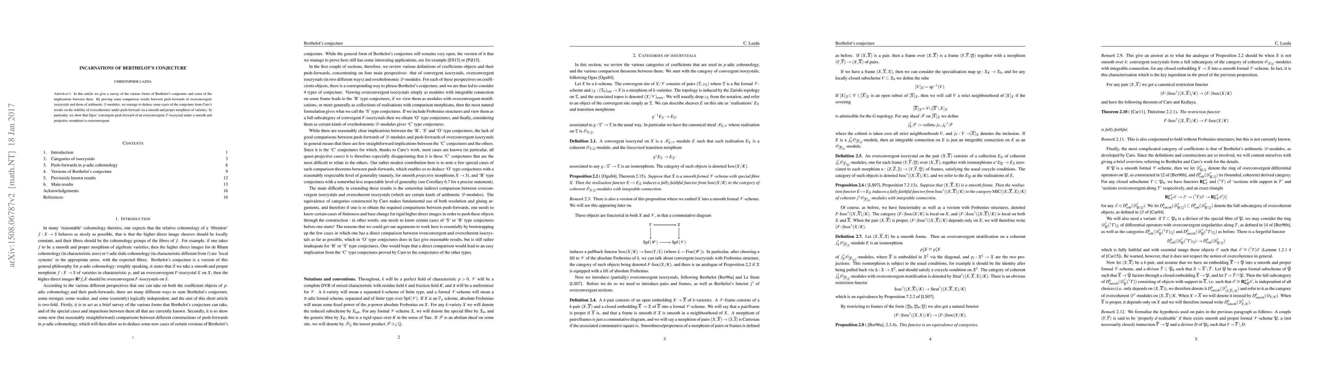 In this article we give a survey of the various forms of Berthelot's conjecture and some of the implications between them. By proving some comparison results between pushforwards of overconvergent isocrystals and those of arithmetic $\mathcal{D}$-modules, we manage to deduce some cases of the conjecture from Caro's results on the stability of overcoherence under pushforward via a smooth and proper morphism of varieties. In particular, we show that Ogus' convergent pushforward of an overconvergent $F$-isocrystal under a smooth and projective morphism is overconvergent.