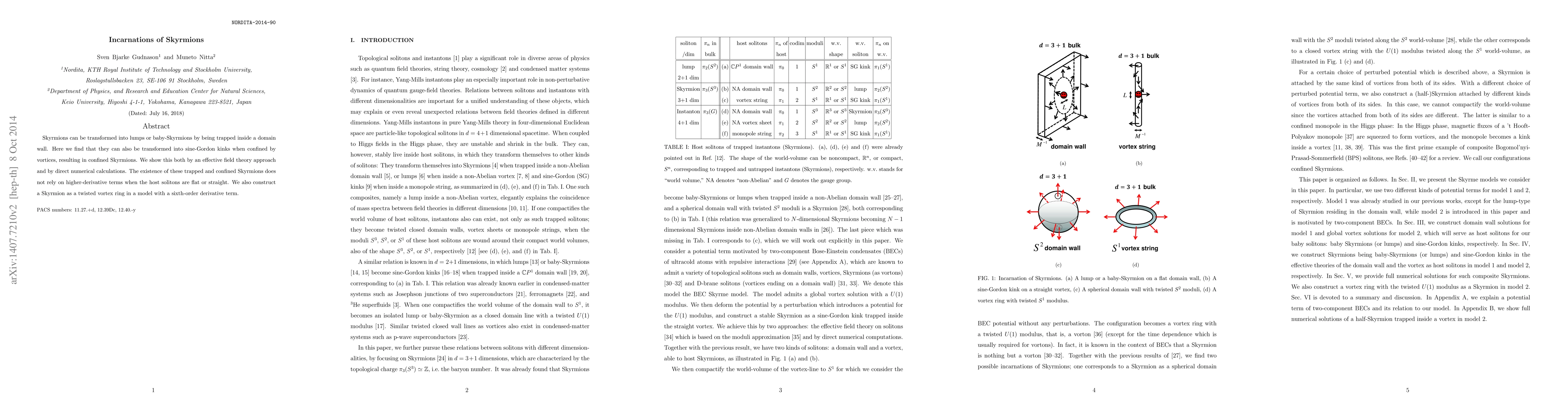 This research explores how skyrmions, topological solitons, can transform into sine-Gordon kinks when confined by vortices, confirmed via effective field theory and numerical calculations. It also constructs skyrmions as twisted vortex rings in models with sixth-order derivative terms.