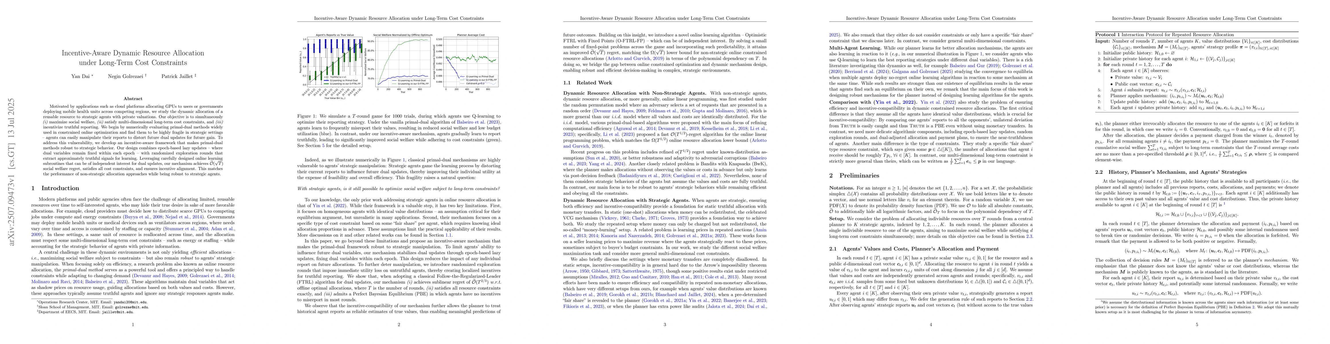 Motivated by applications such as cloud platforms allocating GPUs to users or governments deploying mobile health units across competing regions, we study the dynamic allocation of a reusable resource to strategic agents with private valuations. Our objective is to simultaneously (i) maximize social welfare, (ii) satisfy multi-dimensional long-term cost constraints, and (iii) incentivize truthful reporting. We begin by numerically evaluating primal-dual methods widely used in constrained online optimization and find them to be highly fragile in strategic settings -- agents can easily manipulate their reports to distort future dual updates for future gain. To address this vulnerability, we develop an incentive-aware framework that makes primal-dual methods robust to strategic behavior. Our design combines epoch-based lazy updates -- where dual variables remain fixed within each epoch -- with randomized exploration rounds that extract approximately truthful signals for learning. Leveraging carefully designed online learning subroutines that can be of independent interest for dual updates, our mechanism achieves $\tilde{\mathcal{O}}(\sqrt{T})$ social welfare regret, satisfies all cost constraints, and ensures incentive alignment. This matches the performance of non-strategic allocation approaches while being robust to strategic agents.