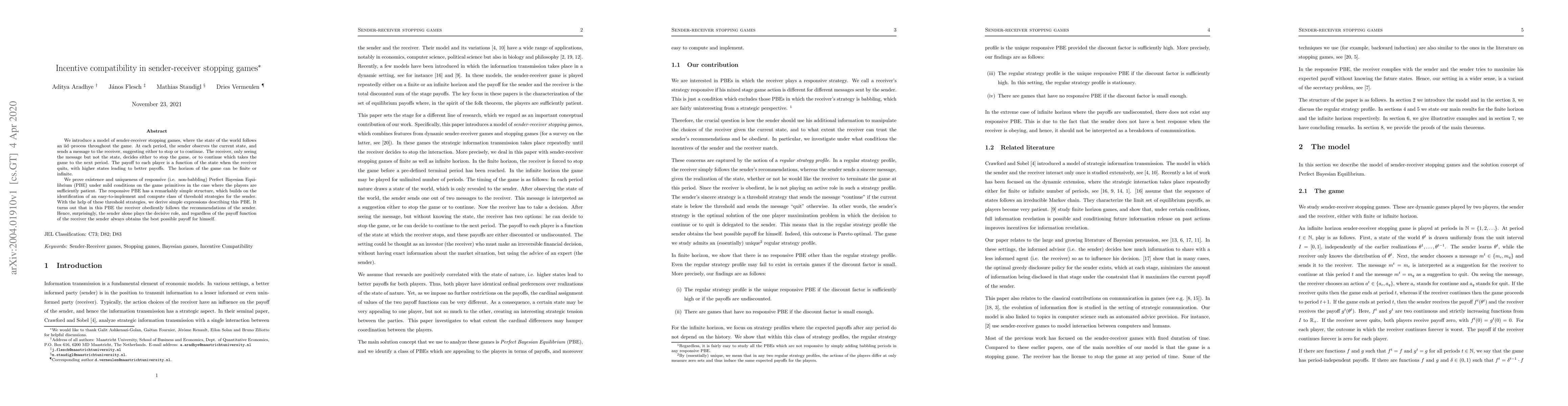 We introduce a model of sender-receiver stopping games, where the state of the world follows an iid--process throughout the game. At each period, the sender observes the current state, and sends a message to the receiver, suggesting either to stop or to continue. The receiver, only seeing the message but not the state, decides either to stop the game, or to continue which takes the game to the next period. The payoff to each player is a function of the state when the receiver quits, with higher states leading to better payoffs. The horizon of the game can be finite or infinite. We prove existence and uniqueness of responsive (i.e. non-babbling) Perfect Bayesian Equilibrium (PBE) under mild conditions on the game primitives in the case where the players are sufficiently patient. The responsive PBE has a remarkably simple structure, which builds on the identification of an easy-to-implement and compute class of threshold strategies for the sender. With the help of these threshold strategies, we derive simple expressions describing this PBE. It turns out that in this PBE the receiver obediently follows the recommendations of the sender. Hence, surprisingly, the sender alone plays the decisive role, and regardless of the payoff function of the receiver the sender always obtains the best possible payoff for himself.