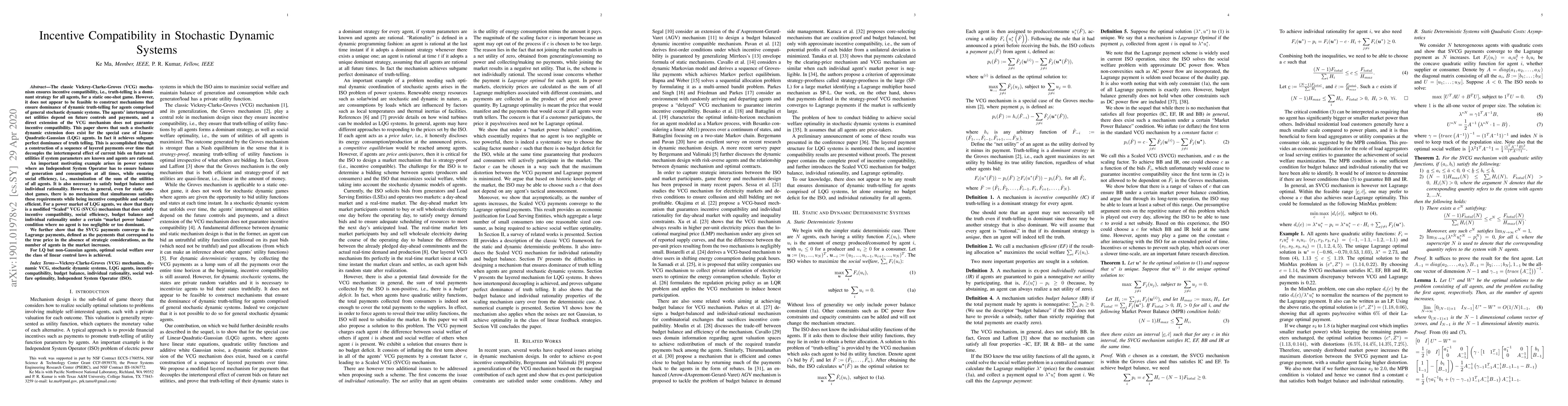 This paper proposes a mechanism for incentive compatibility in stochastic dynamic systems, demonstrating that a sequence of layered payments can ensure truth-telling for LQG agents. It also introduces a "Scaled" VCG mechanism that achieves incentive compatibility, social efficiency, budget balance, and individual rationality under specific market power conditions.
